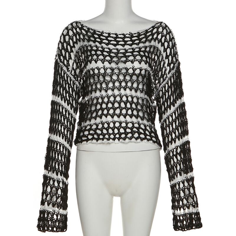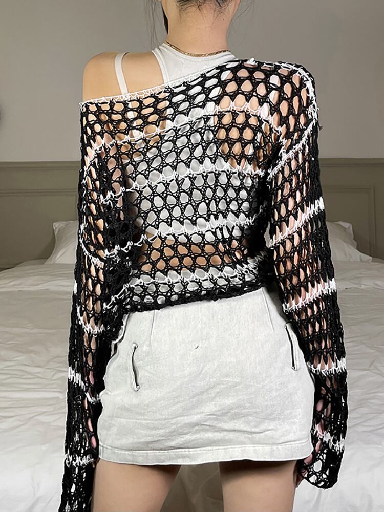 送料無料 ゴスダークニットストライプ中空アウトゴシックスモッククロップトップスグランジ Y2k ルーズ長袖女性プルオーバーパンクニットウェア ロング AE155588775391002527