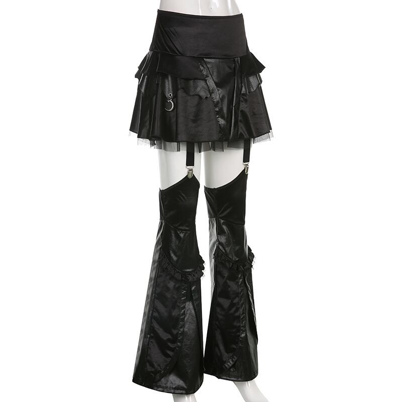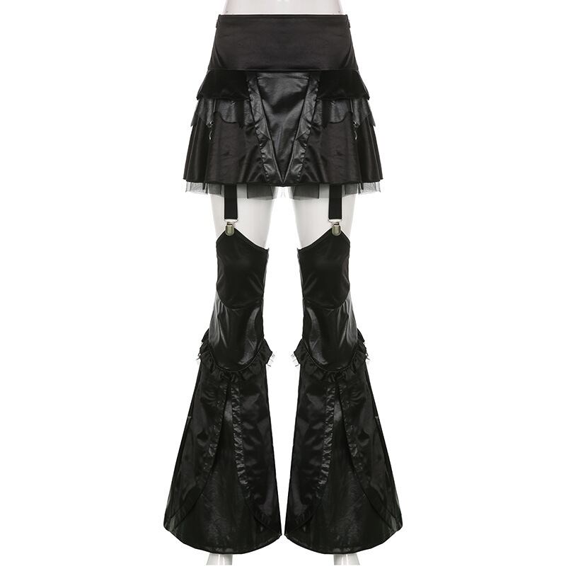 送料無料 ゴスダークモールゴシックパッチワーク女性フレアパンツスカートグランジパンクフェイク Pu 黒ズボンエモ Alt ストリート 2 本セット ブラック ファー AE155588749569502586