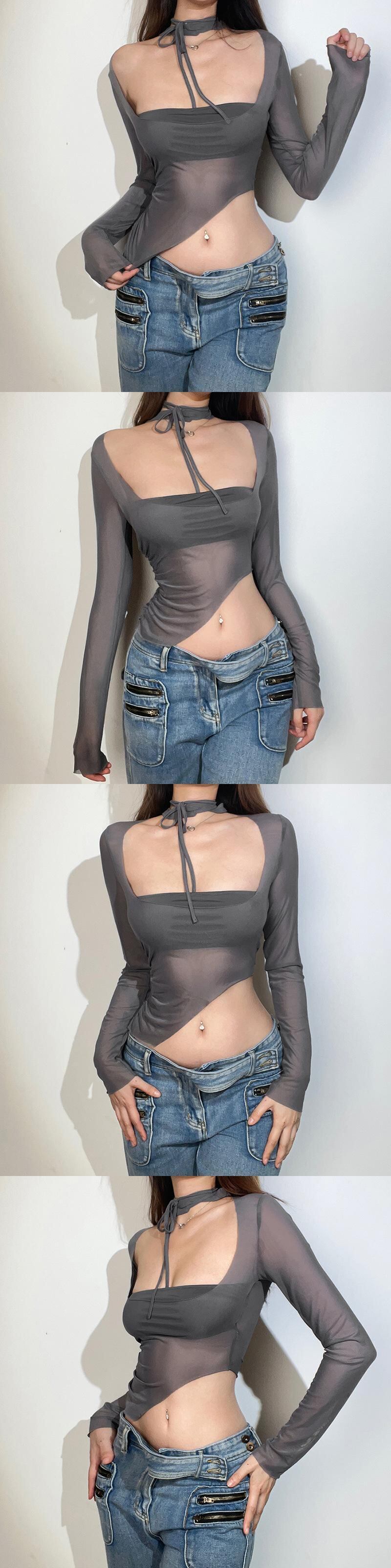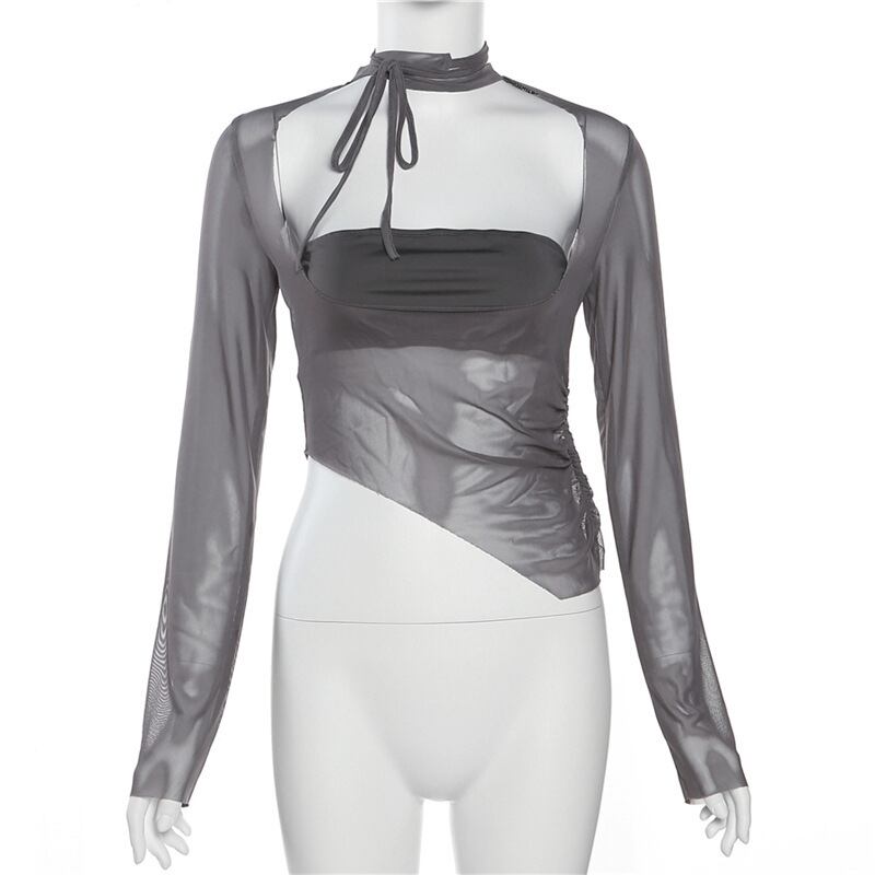 送料無料 ゴスダークメッシュシースルーパッチワークサイバー Y2k Tシャツゴシックパンクスクエアネックレースアップクロップトップス不規則なセクシーなシャーリング服 スクウェア AE155588764775200504