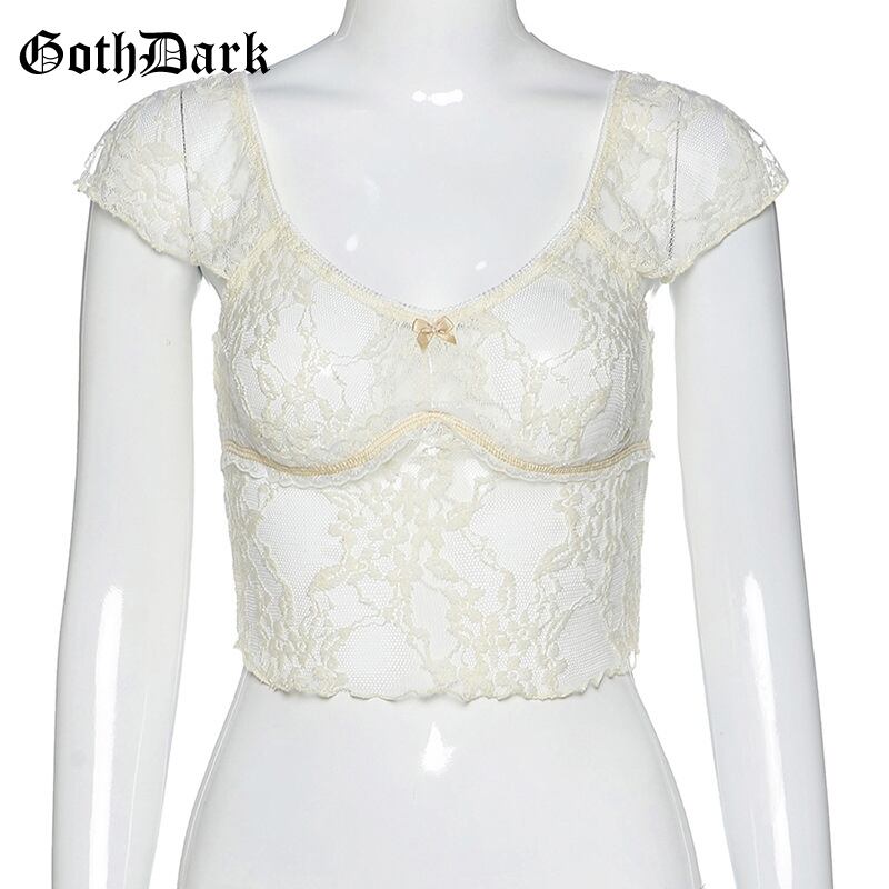 送料無料 ゴスダーク原宿かわいいレース e 夏クロップトップス Y2k セクシーなゴシックメッシュ女性トップヴィンテージ白スキニー服 ホワイト 大人ガーリー スウィート キュート カジュアル サマー 夏物 ビンテージ AE155588713075117895