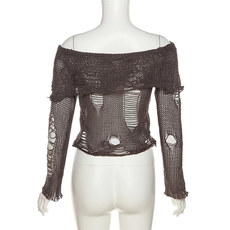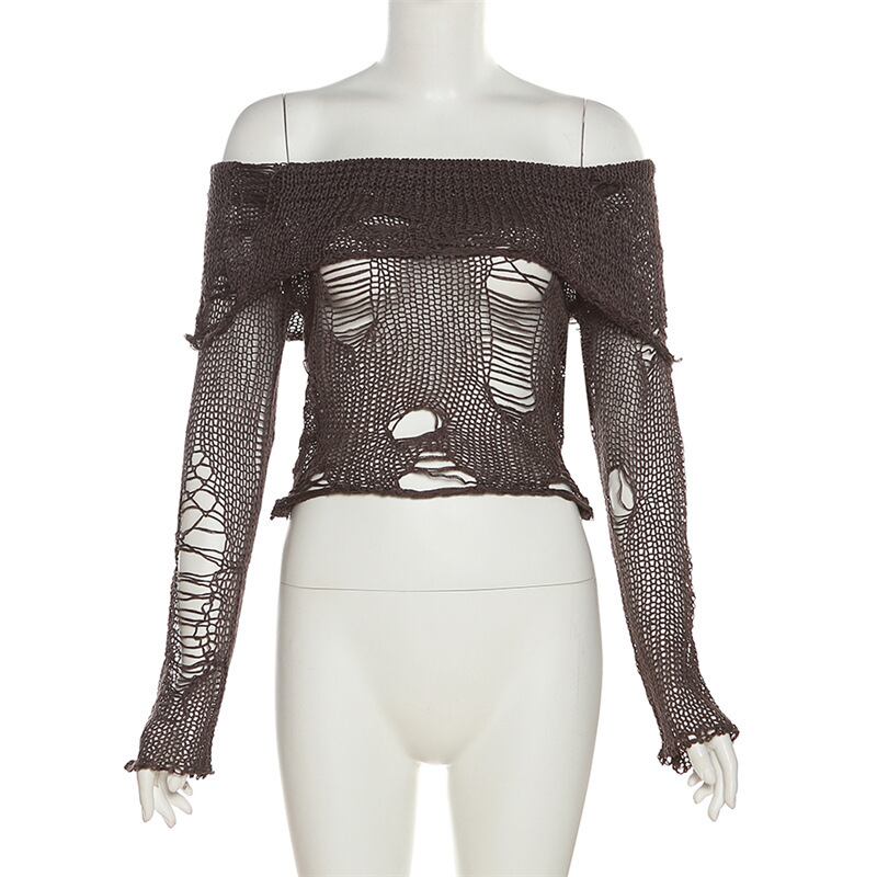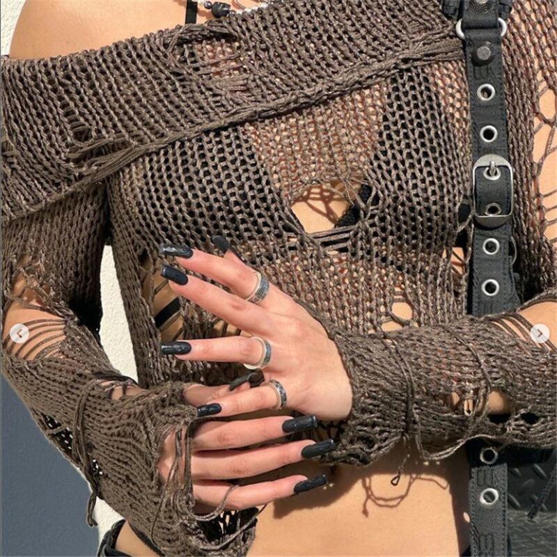 送料無料 ゴスダーク中空アウト Y2k ストリートニット Tシャツレトロ妖精グランジセクシーなスラッシュネッククロップトップス女性ヴィンテージゴシックセーター ビンテージ AE155588797876842904