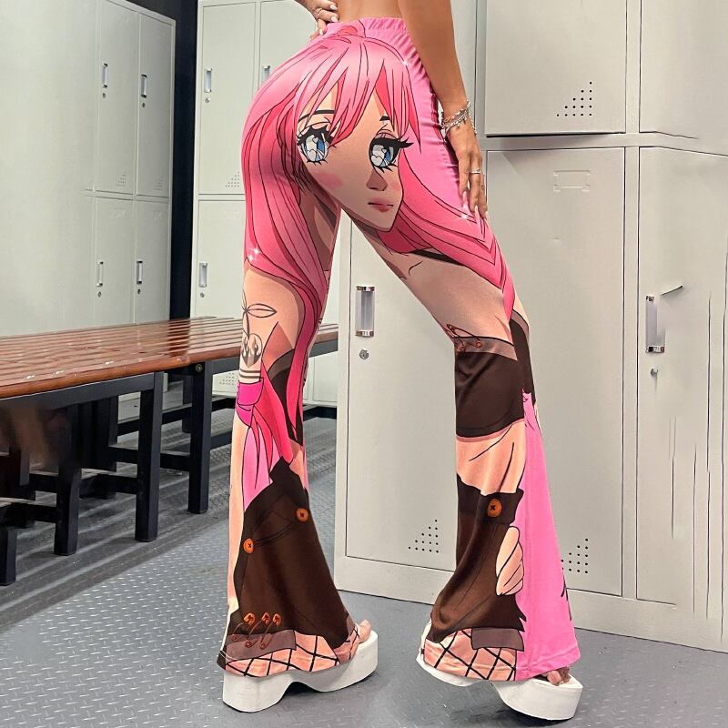 送料無料 ゴスダーク原宿柄かわいいフレアパンツ Y2k かわいいウエスト漫画ボトムス女性を上げるスキニーストリート 大人ガーリー スウィート キュート カジュアル AE155588793919192857