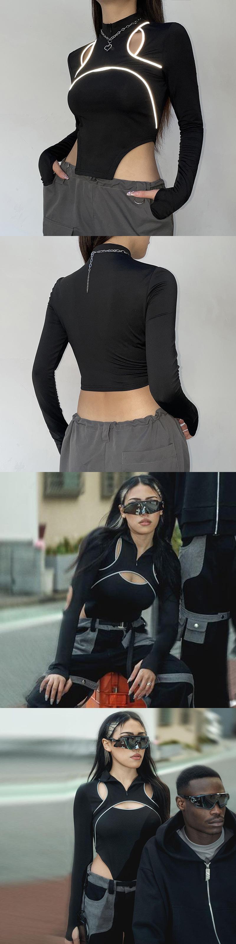 送料無料 ゴスダークモト & バイカー反射 Techwear セクシーな Tシャツサイバーゴシック Y2k 中空アウト女性ブラウスグランジジップ長袖クロップトップ ロング AE155588792163330831