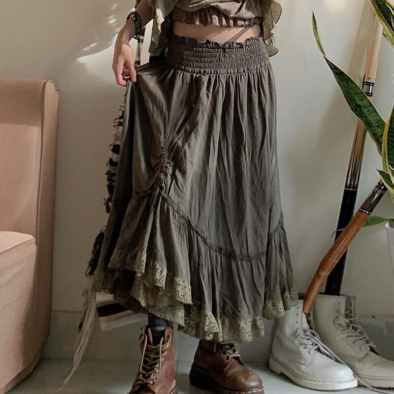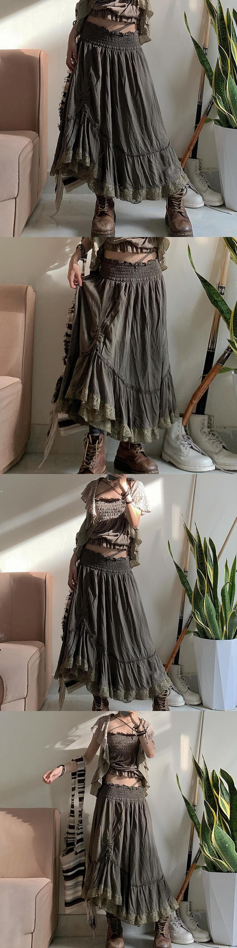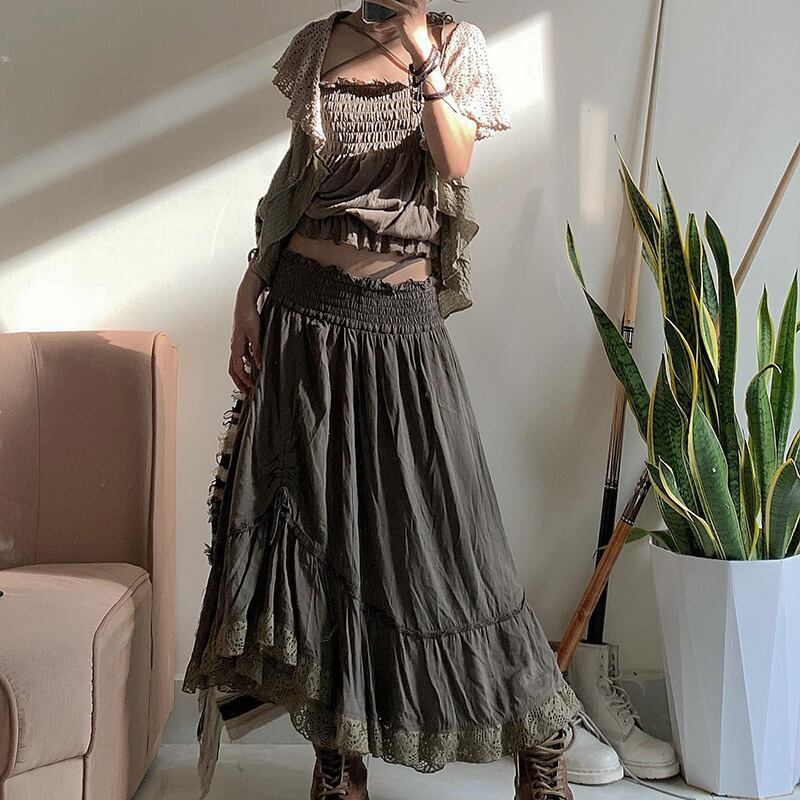 送料無料 ゴスダーク妖精レーススプライスシャーリングミディスカートレトロY2kグランジフリル非対称ボトムスゴブリンコアストリートロングスカート ラッフル AE155588747389420589