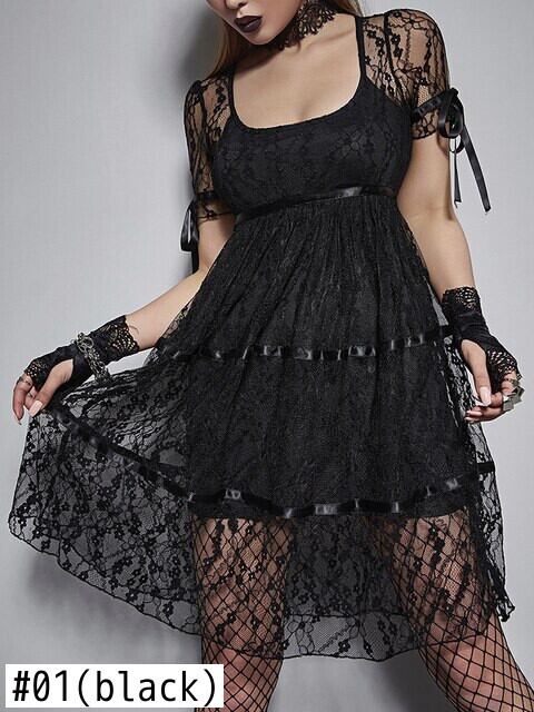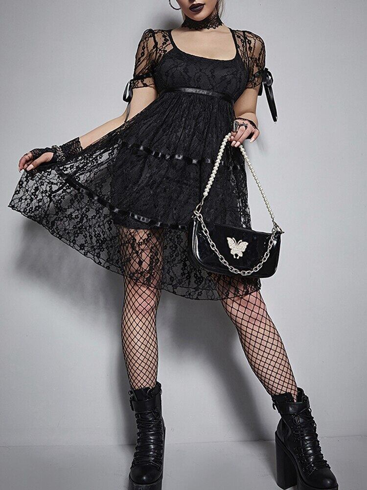 送料無料 ゴスダークレースモールゴシック美的黒人女性のドレスグランジシースルーセクシーなパフスリーブミニドレス A ライン夏のパーティーウェア ブラック サマー 夏物 Aライン AE155588751388384047