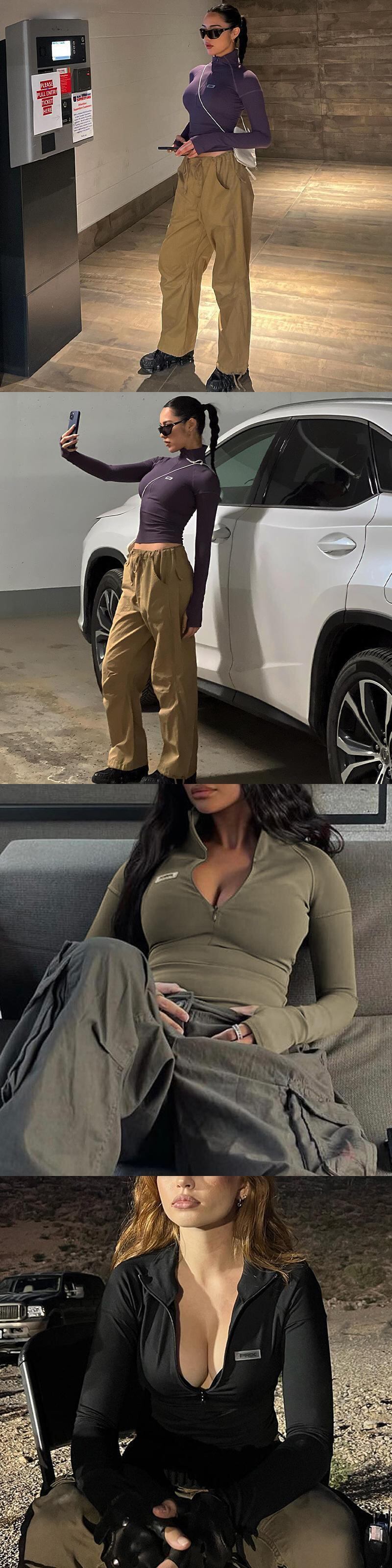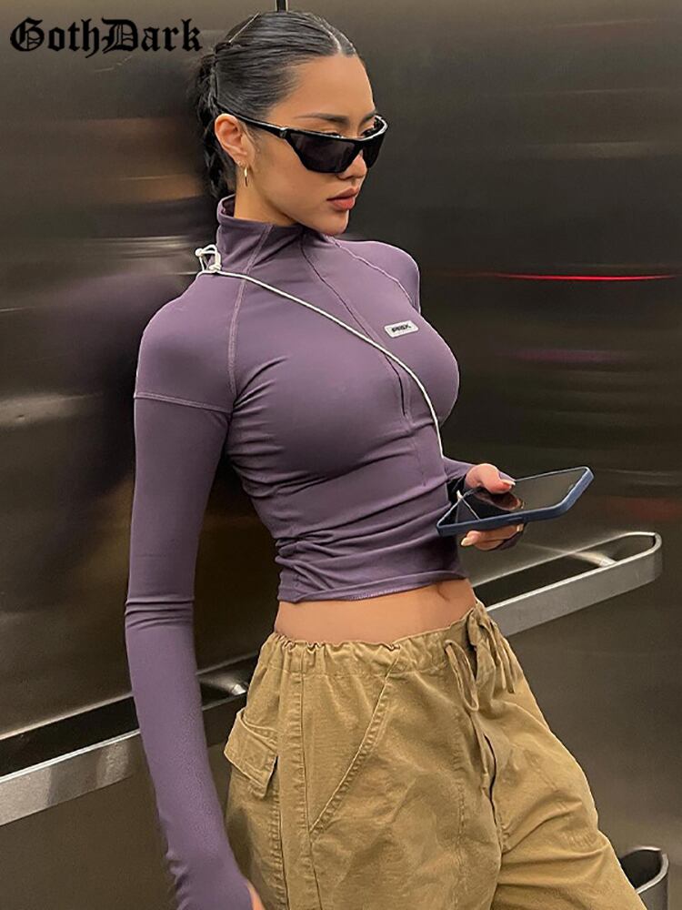 送料無料 ゴスダークモックネックボディコンモトバイカーブラウスサイバー Y2k パンクジップアップ長袖 Tシャツ女性グランジタグストリートクロップトップス ロング AE155588731208255618