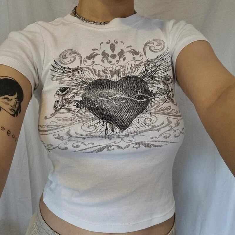 送料無料 ゴスダーク Y2k グランジストリートハートプリント Tシャツエモモールゴシックボディコン女性クロップトップス半袖 Alt ショート ハーフスリーブ AE155588725007001950