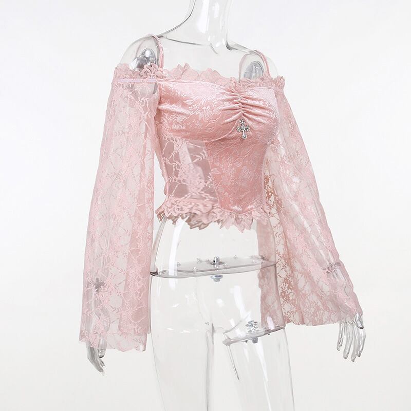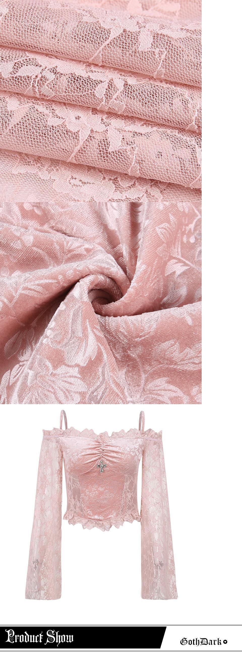 送料無料 ゴスダークベルベットロリータピンク甘いスラッシュネックブラウスレースパッチワークパステルゴシックフレアスリーブTシャツセクシーな原宿クロップトップス 大人ガーリー スウィート キュート カジュアル かわいい AE155588769002278193
