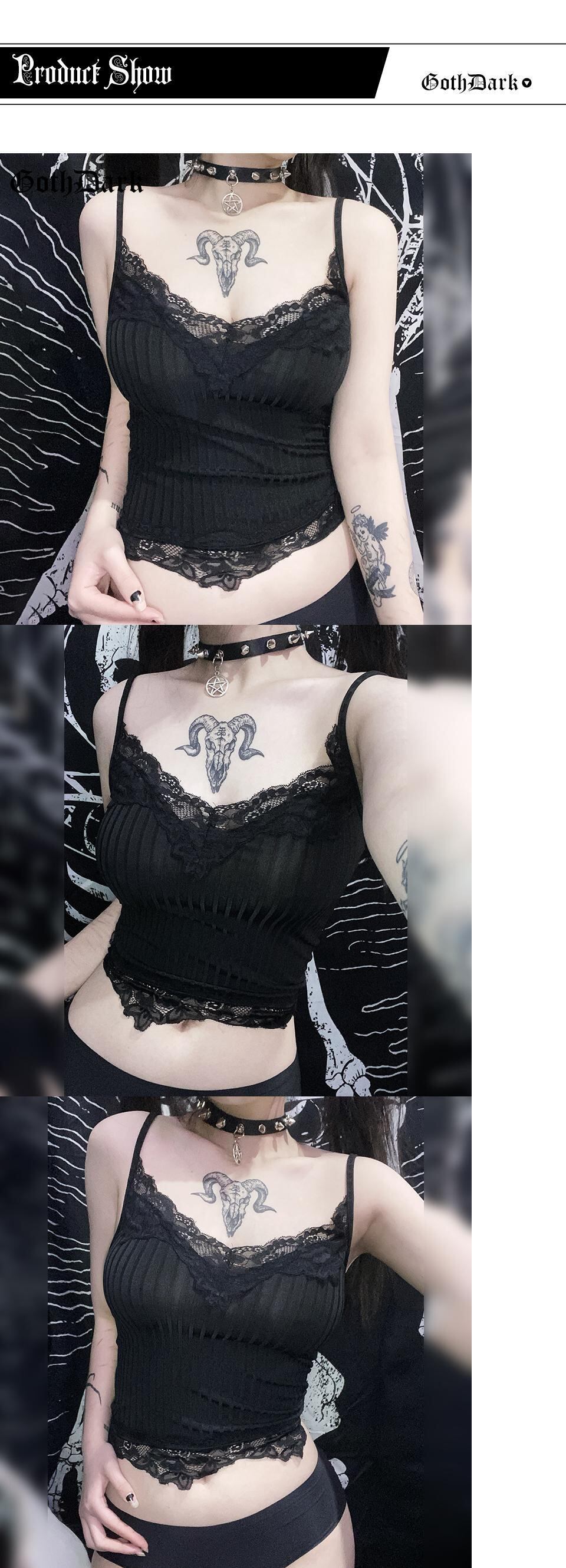 送料無料 ゴスダークモールゴシック基本ボディコン女性キャミソールグランジパンクブラックレーストリムクロップトップスリブ背中の開いた Alt 服夏 サマー 夏物 AE155588769362612953