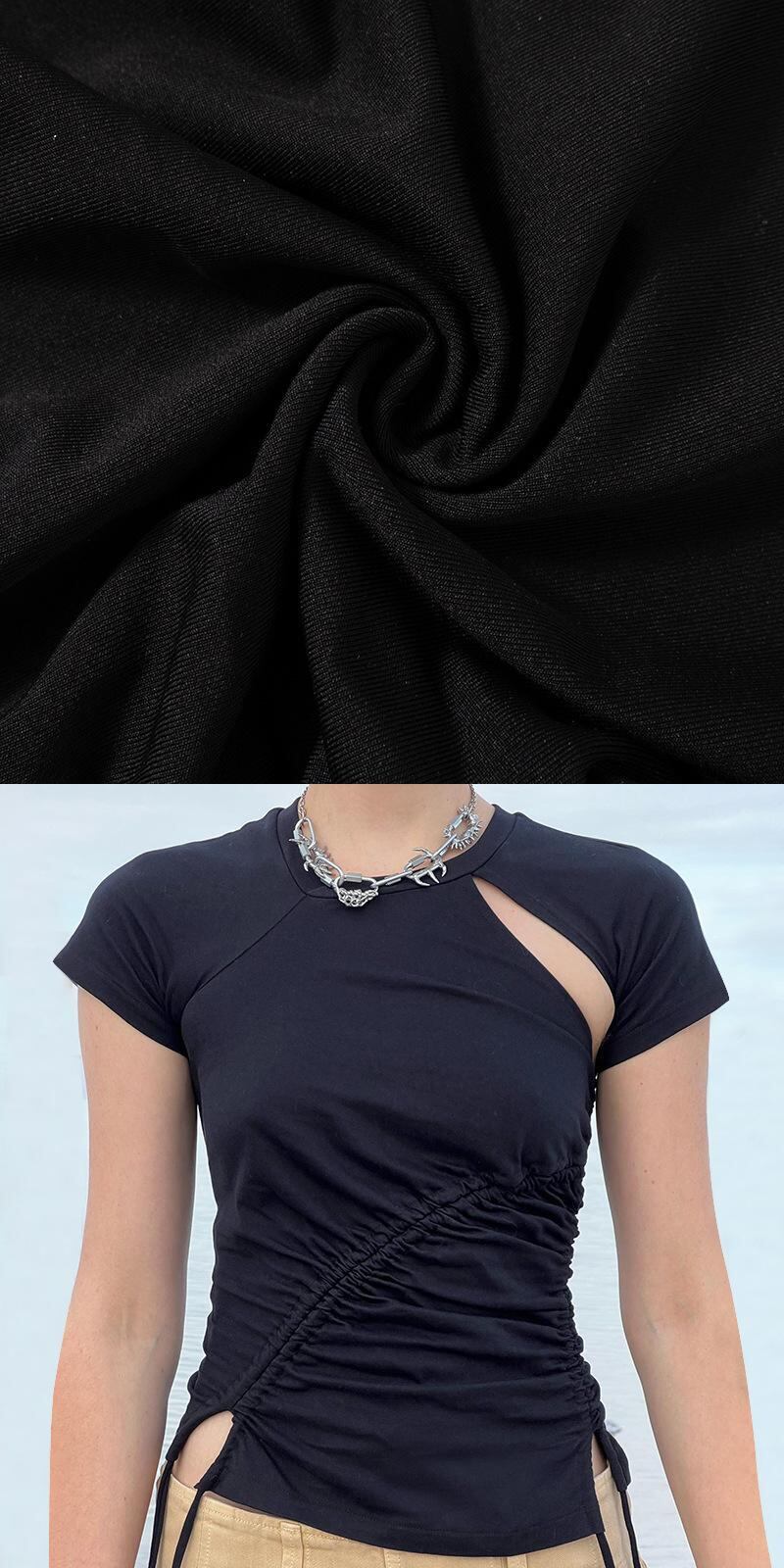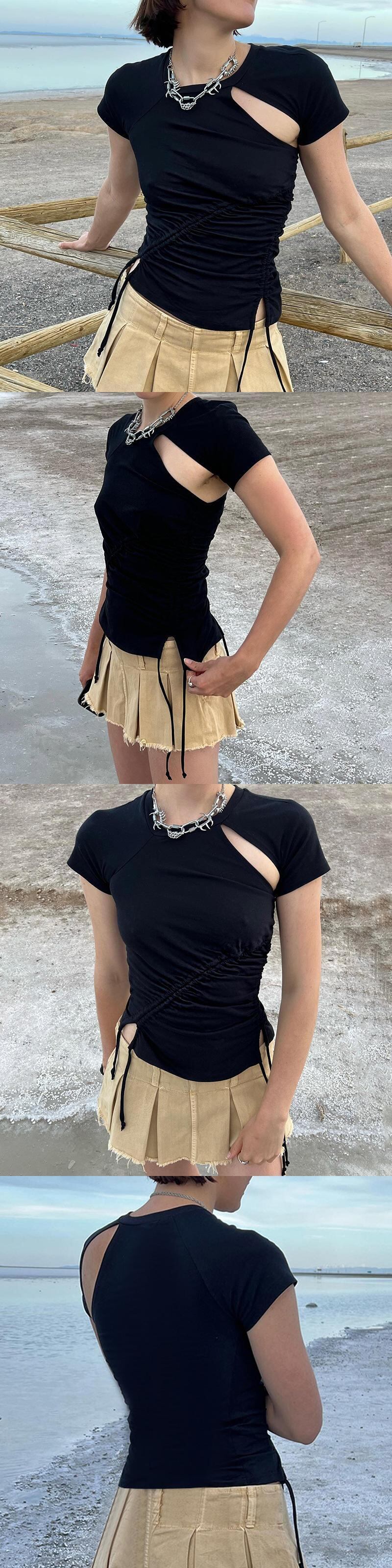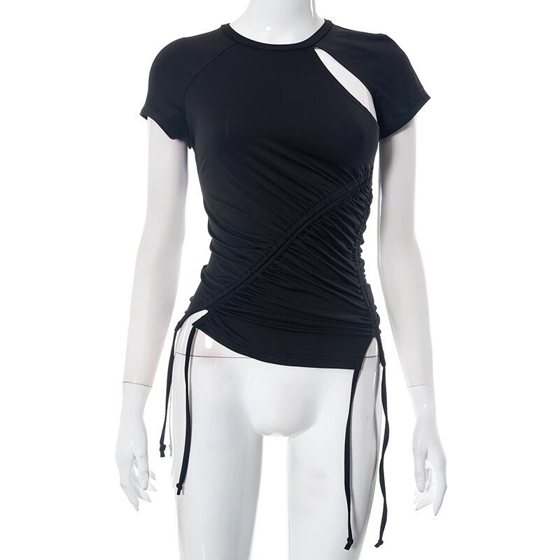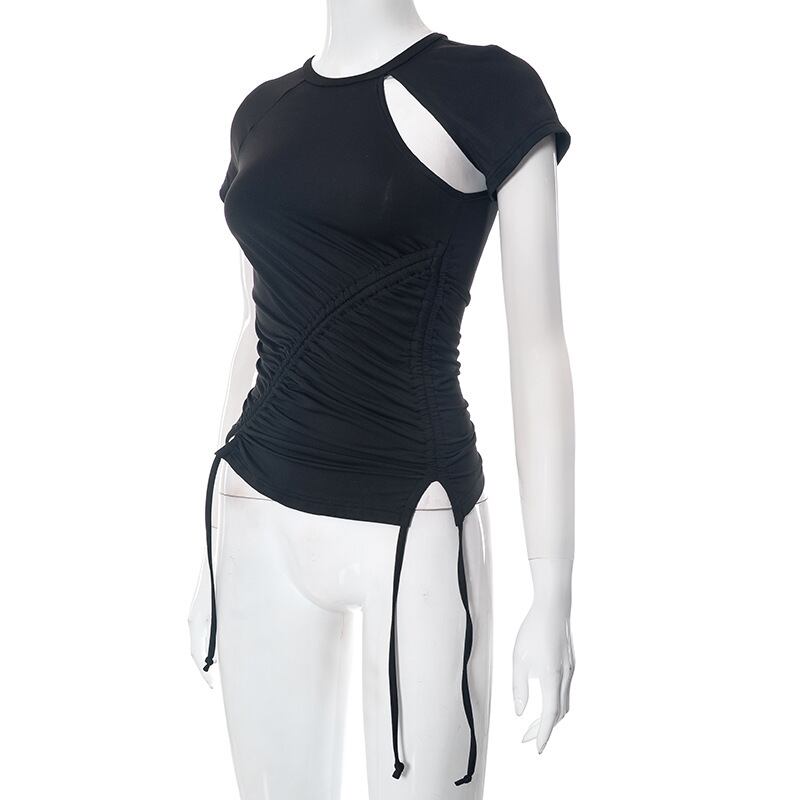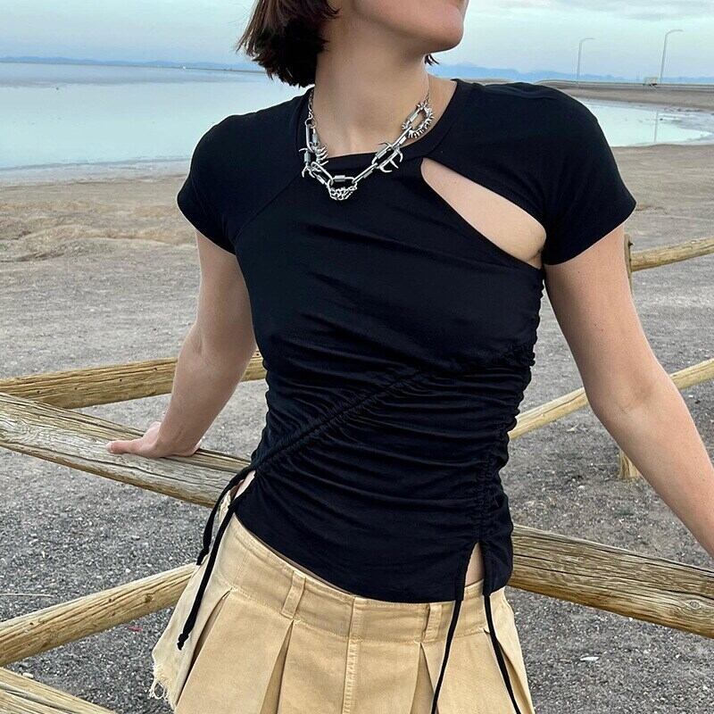送料無料 ゴスダークサイバーゴシック巾着セクシーな Tシャツ Y2k パンク不規則な中空アウト女性トップスグランジ半袖ボディコン Tシャツ ショート ハーフスリーブ AE15558875891198555