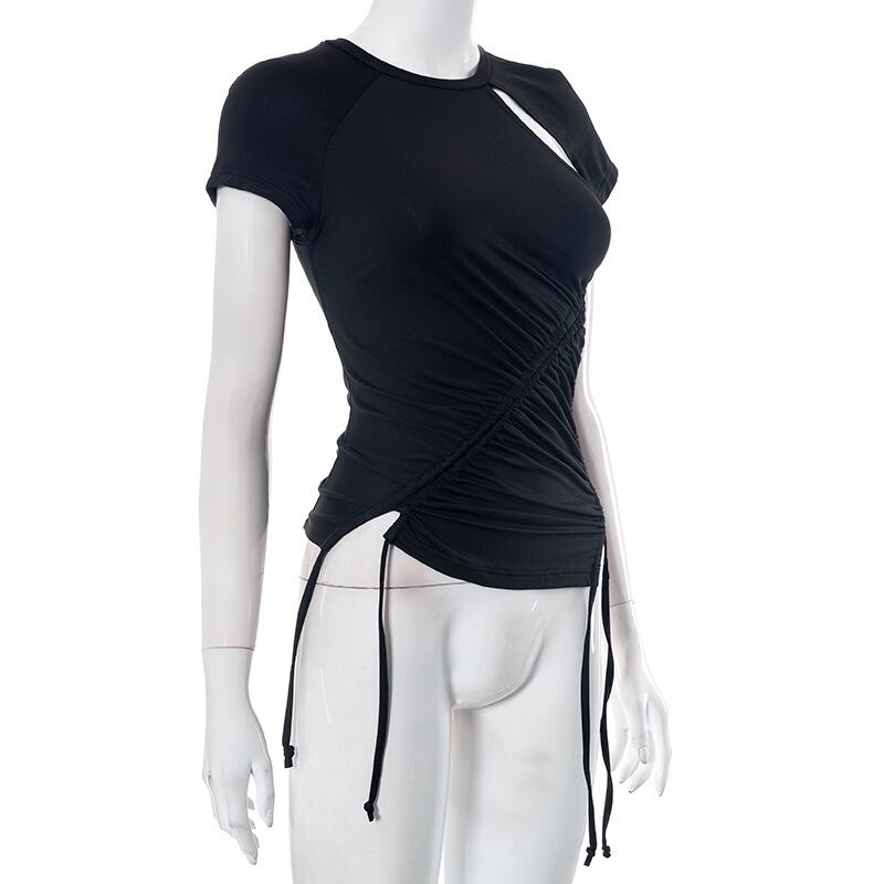 送料無料 ゴスダークサイバーゴシック巾着セクシーな Tシャツ Y2k パンク不規則な中空アウト女性トップスグランジ半袖ボディコン Tシャツ ショート ハーフスリーブ AE15558875891198555 | 女性の為の通販サイト-fashion navi
