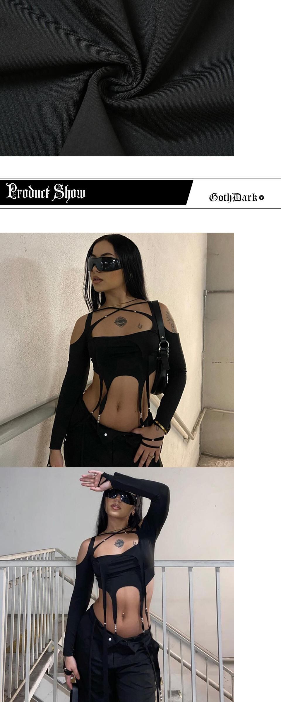 送料無料 ゴスダークグランジカットアウト不規則なサイバー Y2k Tシャツゴシックパンクボディコン女性のセクシーなクロップトップス黒長袖ストリート Tシャツ ロング ブラック AE155588776522522022