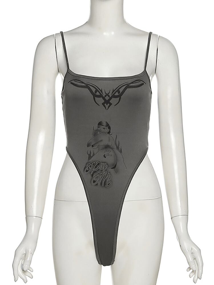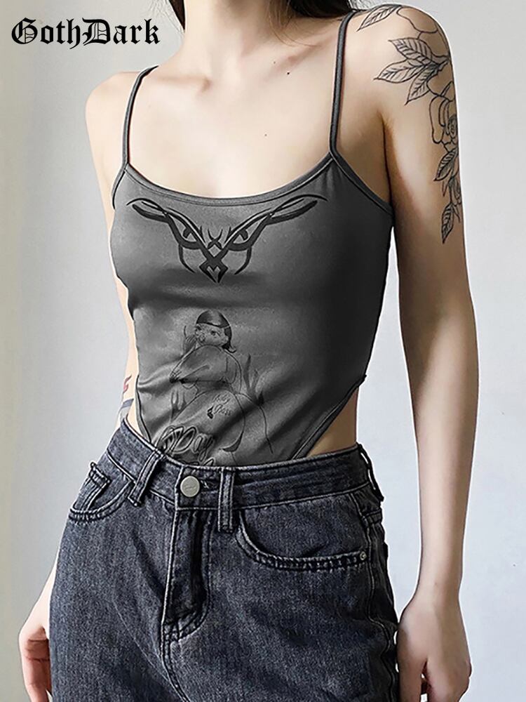 送料無料 ゴスダークグラフィックプリントゴシック美的女性ボディスーツグランジセクシーなノースリーブスキニートップス Y2k パンク夏エモボディスーツ サマー 夏物 AE155588778331542801