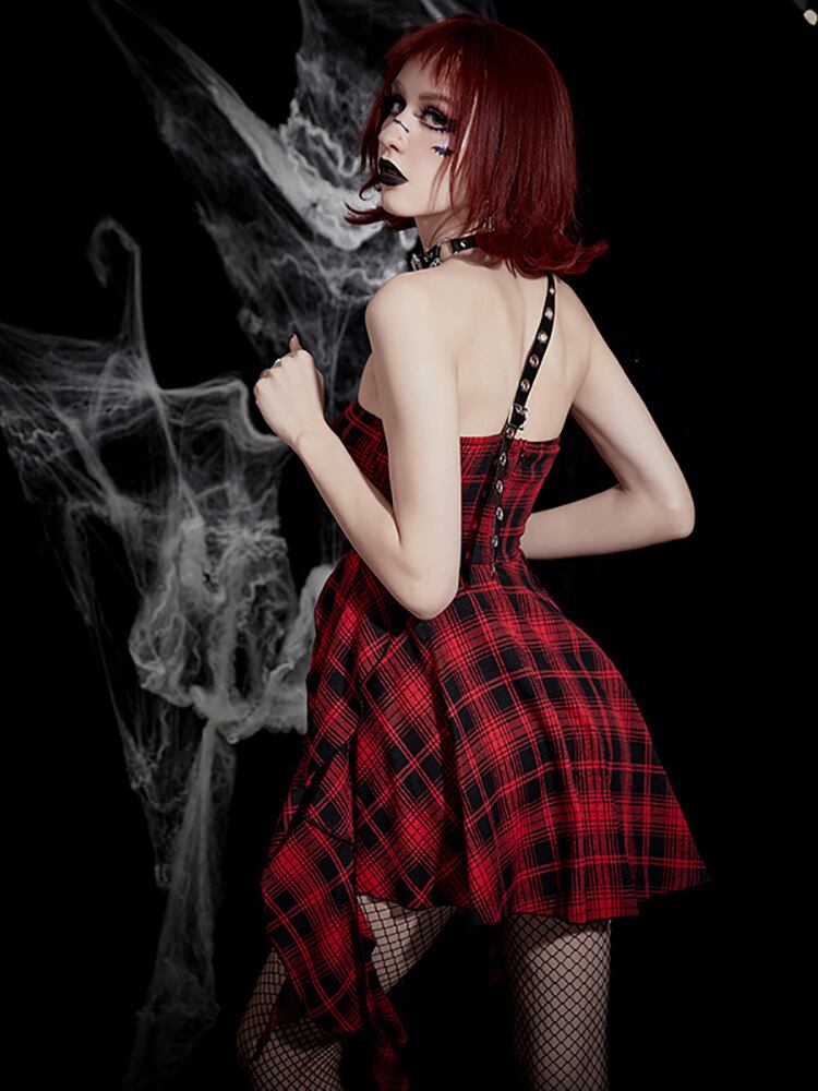 送料無料 ゴスダークチェック柄フリルストラップレスゴシックブラッドドレスグランジ美的フェイク Pu ベルトパッチワークドレス女性 A ラインセクシーなパーティーウェア ラッフル ハーネス ファー Aライン AE155588779710948314 | 女性の為の通販サイト-fashion navi