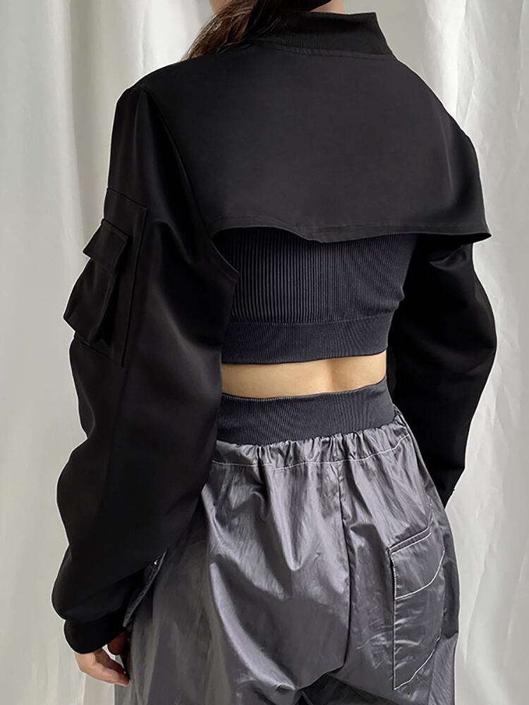送料無料 ゴスダークグランジヒップホップジップパッチワーク女性作物ジャケットゴシックパンクストリートスリムコート Y2k 黒ポケット生き抜くトップ ブラック AE155588756303129411
