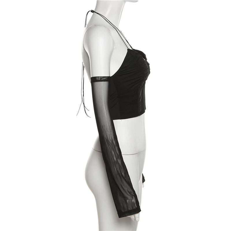 送料無料 ゴスダークシャーリング薄手のセクシーなサイバー Y2k キャミソールゴシックパンクメッシュパッチワーククロップトップスとグローブスリーブグランジ背中の開いたホルター Tシャツ AE155588796119106795