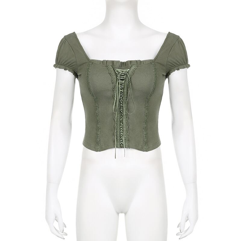 送料無料 ゴスダークフェアリーコア包帯スクエアネック Tシャツレトロ Y2k グランジパフスリーブレース裾クロップトップスヴィンテージゴシック女性ストリート スクウェア ビンテージ AE155588788737504823
