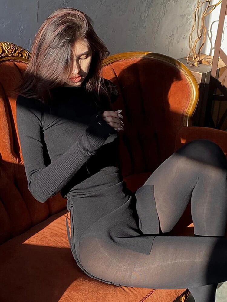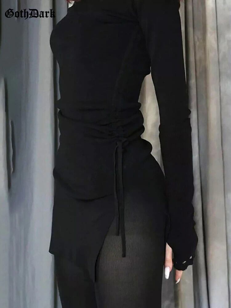 送料無料 ゴスダークモールゴシック巾着ボディコン女性ミニドレス Y2k パンク黒スプリットセクシーな長袖ドレスグランジ基本パーティーウェア ロング ブラック AE155588736065643192