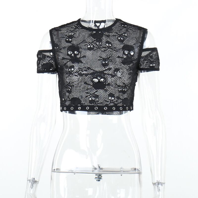 送料無料 ゴスダーク網タイツスカルオープンショルダーエモオルト Tシャツグランジモールゴシックアイレットセクシーな女性クロップトップス Transprent 半袖 Tシャツ ショート ハーフスリーブ AE155588717710886097