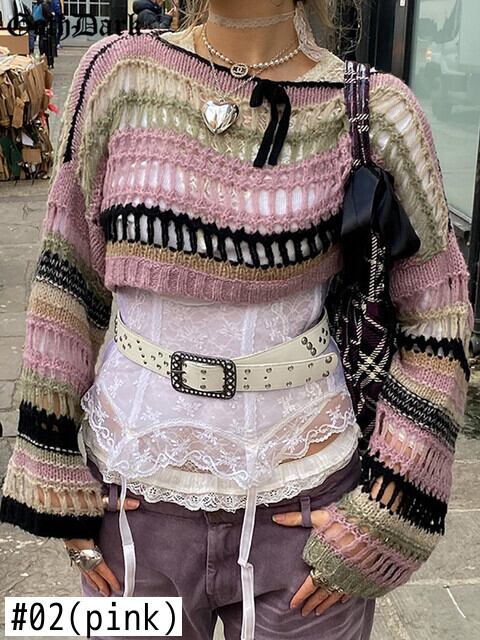 送料無料 ゴスダークキットヴィンテージゴシックルーズ中空アウトセーターレトロ Y2k 妖精グランジストリートクロップすくめトップスセクシーなストライプ生き抜く ビンテージ AE155588727922140957