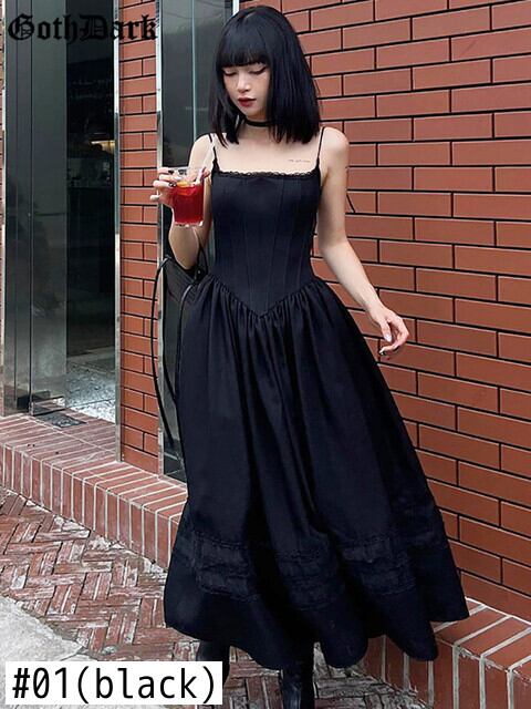 送料無料 ゴスダークロリータモールゴシックボディコンロングドレス E-グランジスタイルレースアップ女性黒ドレス Alt セクシーなスリングパーティーウェア ブラック AE155588711099526529