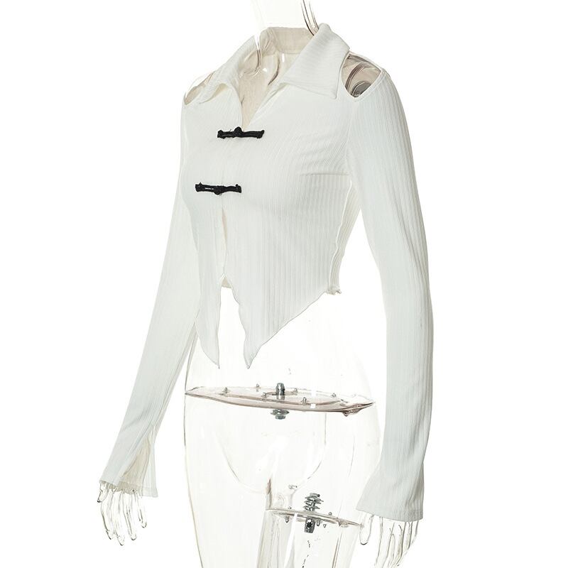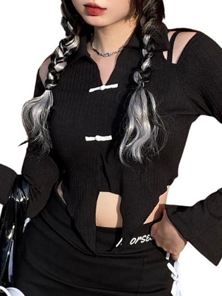 送料無料 ゴスダークゴシックオープンショルダー中国風ブラウスグランジターンダウンカラー女性クロップトップス Y2k 長袖 Tシャツ ロング AE155588771942497700