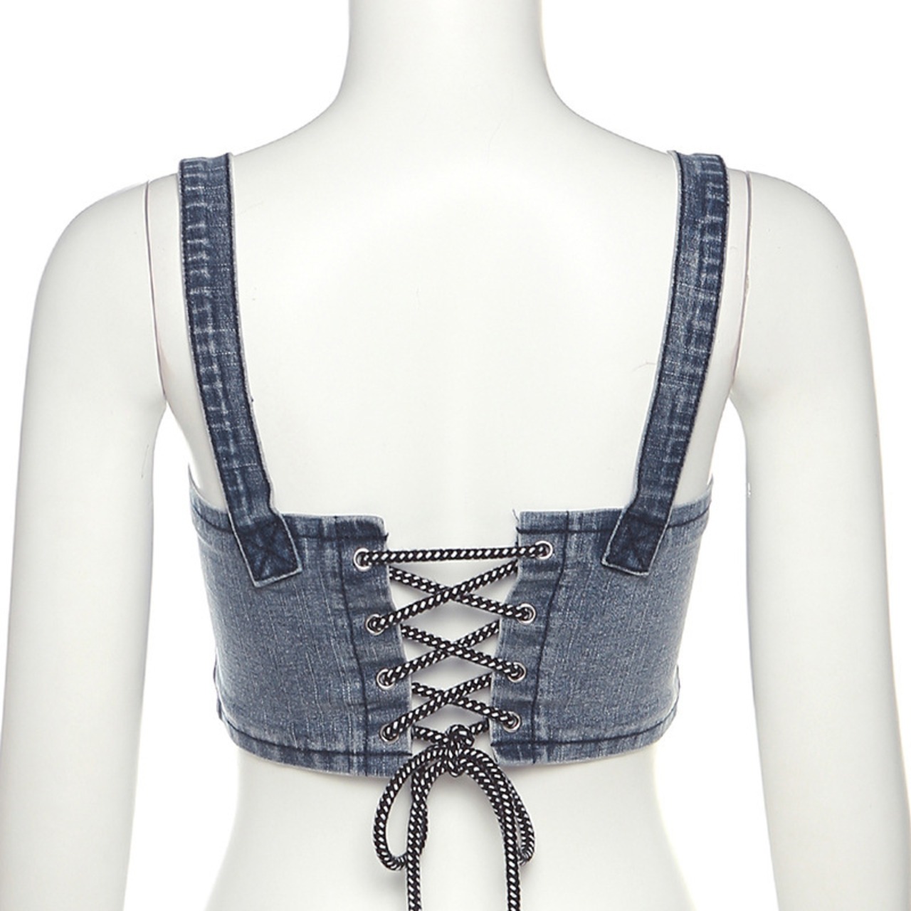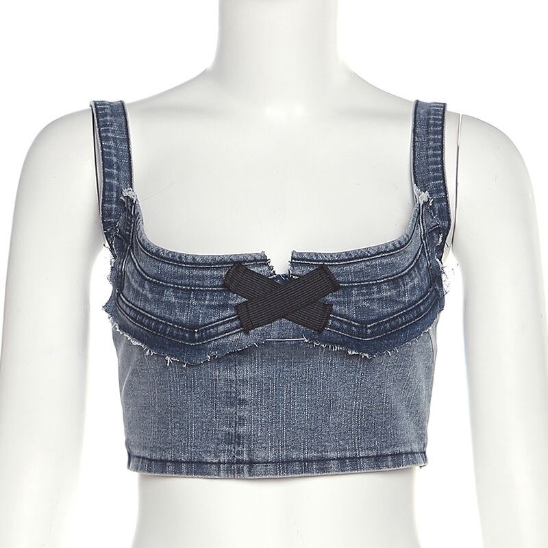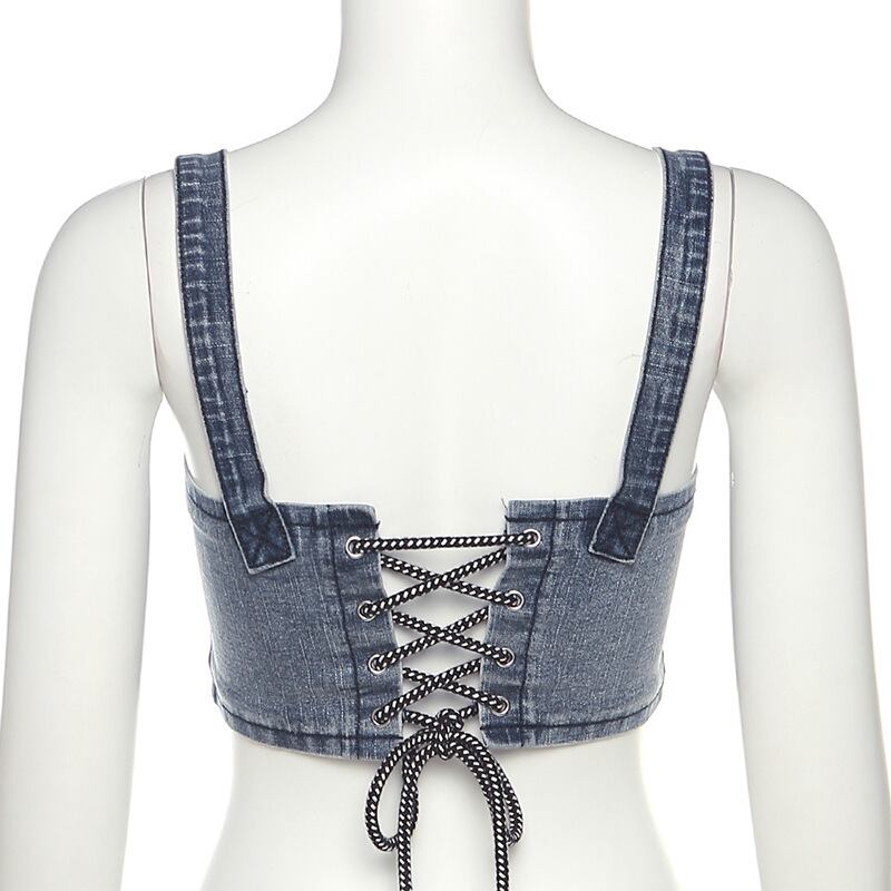 送料無料 ゴスダークゴシックスクエアネックセクシーなデニムタンクトップヴィンテージストリート Y2k スリム女性クロップトップ包帯パッチワーク背中の開いたビスチェ スクウェア ビンテージ AE155588798962987328