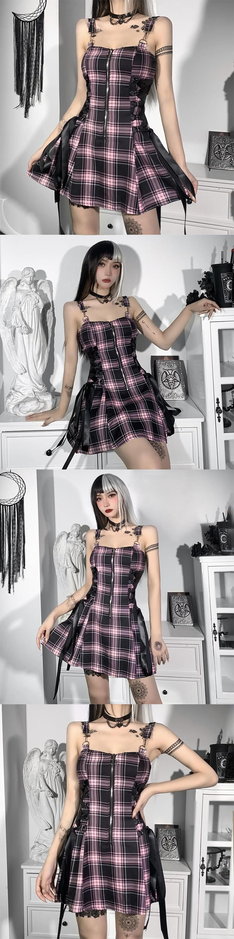 送料無料 ゴスダークパステルゴシック原宿ピンク女性ミニドレスチェック柄モールゴスグランジパンク黒エモセクシーなパーティーウェアレースアップクラブドレス ブラック かわいい AE155588794275050321