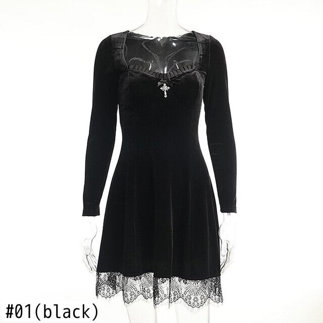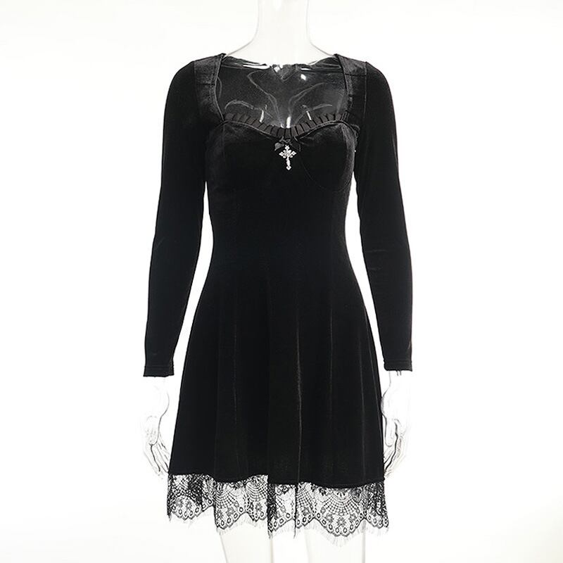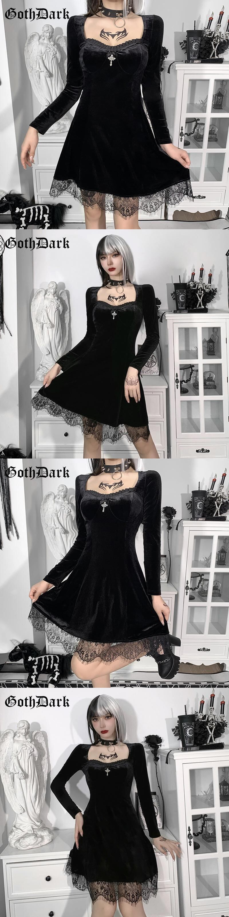送料無料 ゴスダークヴィンテージゴシックベロア秋ドレス女性 Alt 服グランジ長袖ボディコンパーティーウェアレーストリム A ラインドレス ロング オータム 秋物 Aライン ビンテージ AE155588714561330385