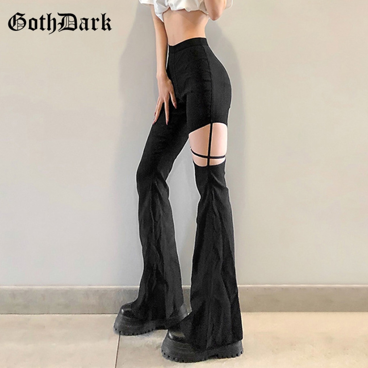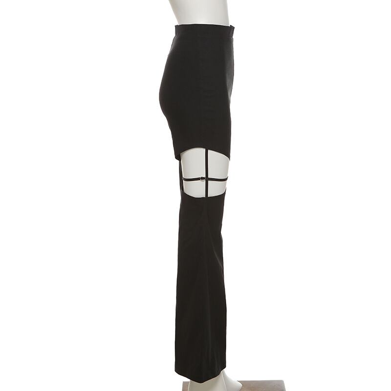 送料無料 ゴスダークパンク黒人女性サイバーフレアパンツゴシックeグランジウエスト中空ズボンパッチワーク夏服 ブラック サマー 夏物 AE15558875496278491