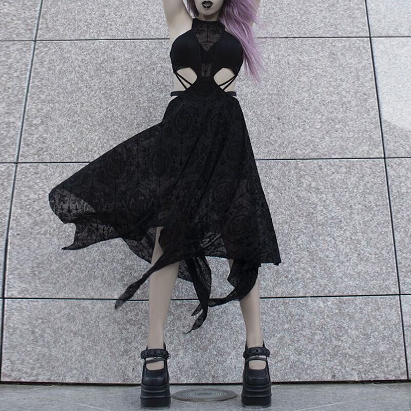 送料無料 ゴスダークモールゴシックメッシュパッチワークセクシーなドレスグランジ美的不規則な中空アウトドレスパンクエモ女性植毛オルタナティブ衣装 AE155588765979847101