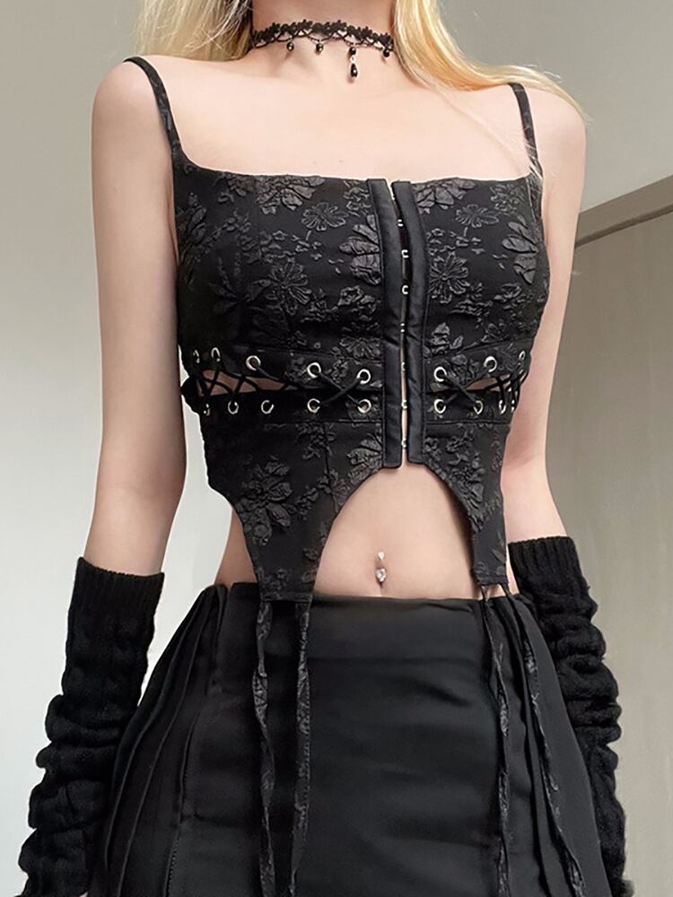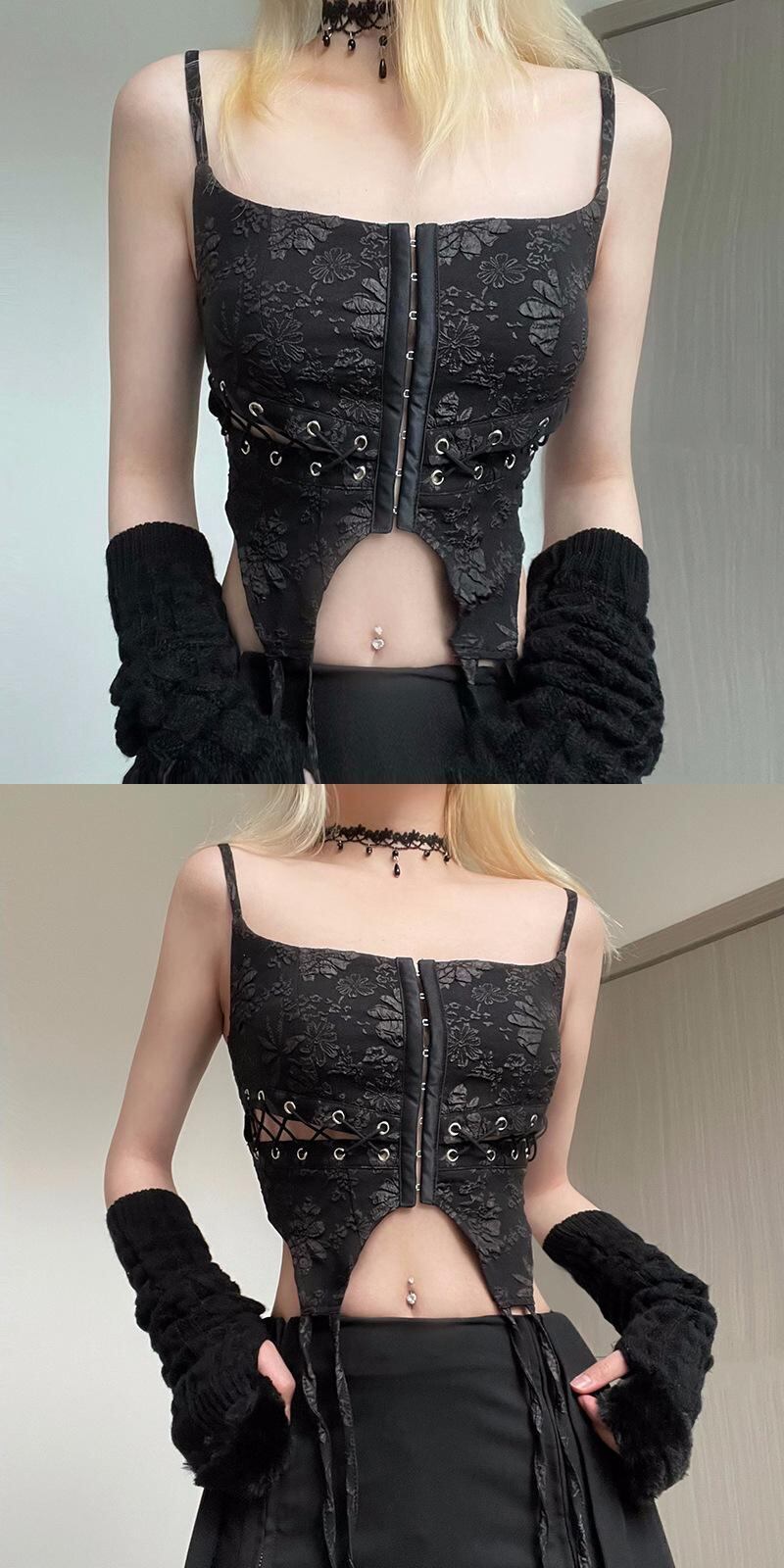 送料無料 ゴスダークゴシック美的傷リベット黒キャミソールグランジスタイルレースアップヴィンテージ女性クロップトップススキニー中空アウト代替衣装 ブラック ビンテージ AE155588721551772467