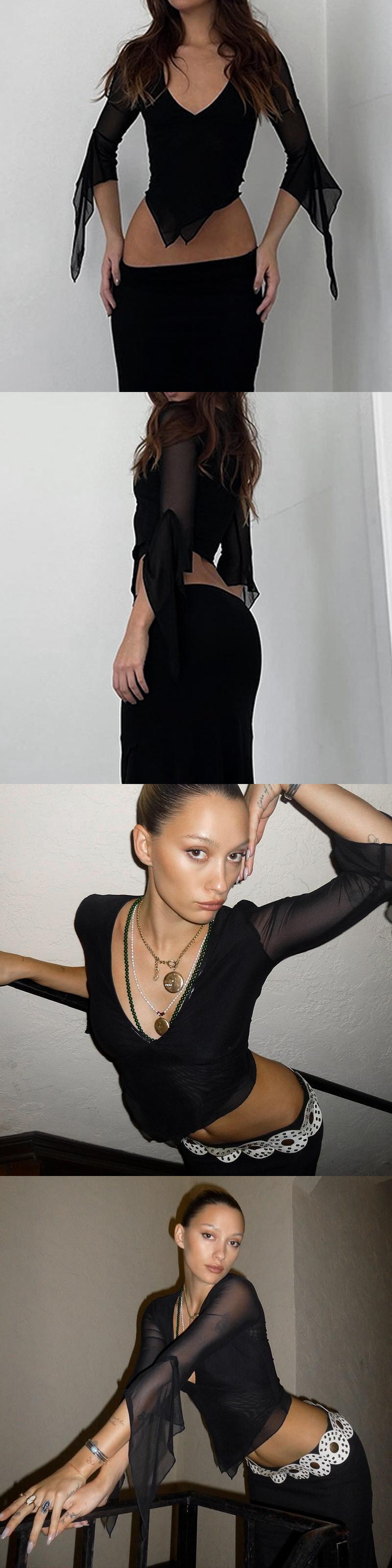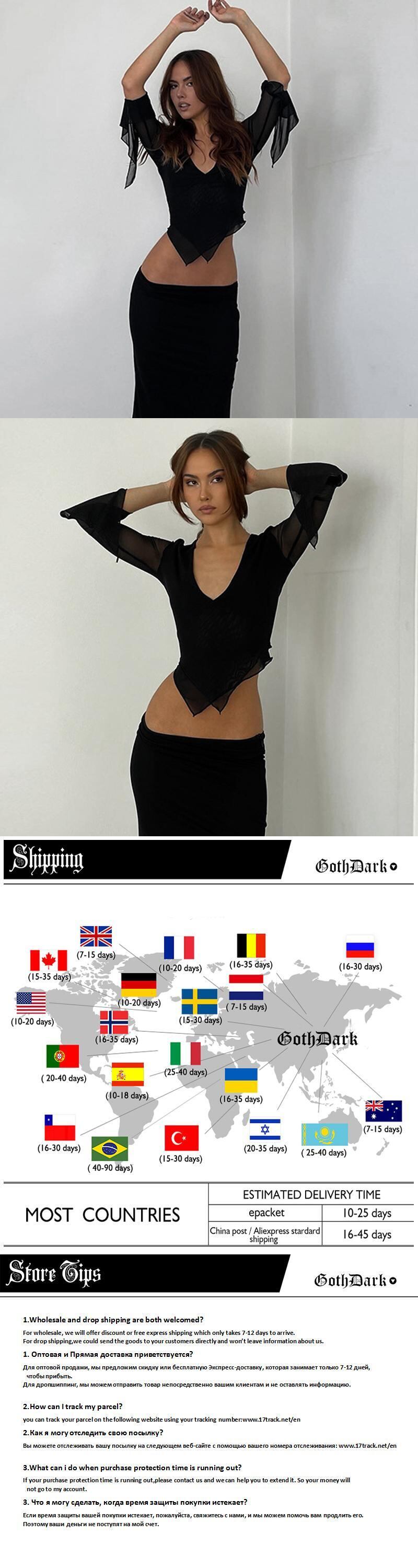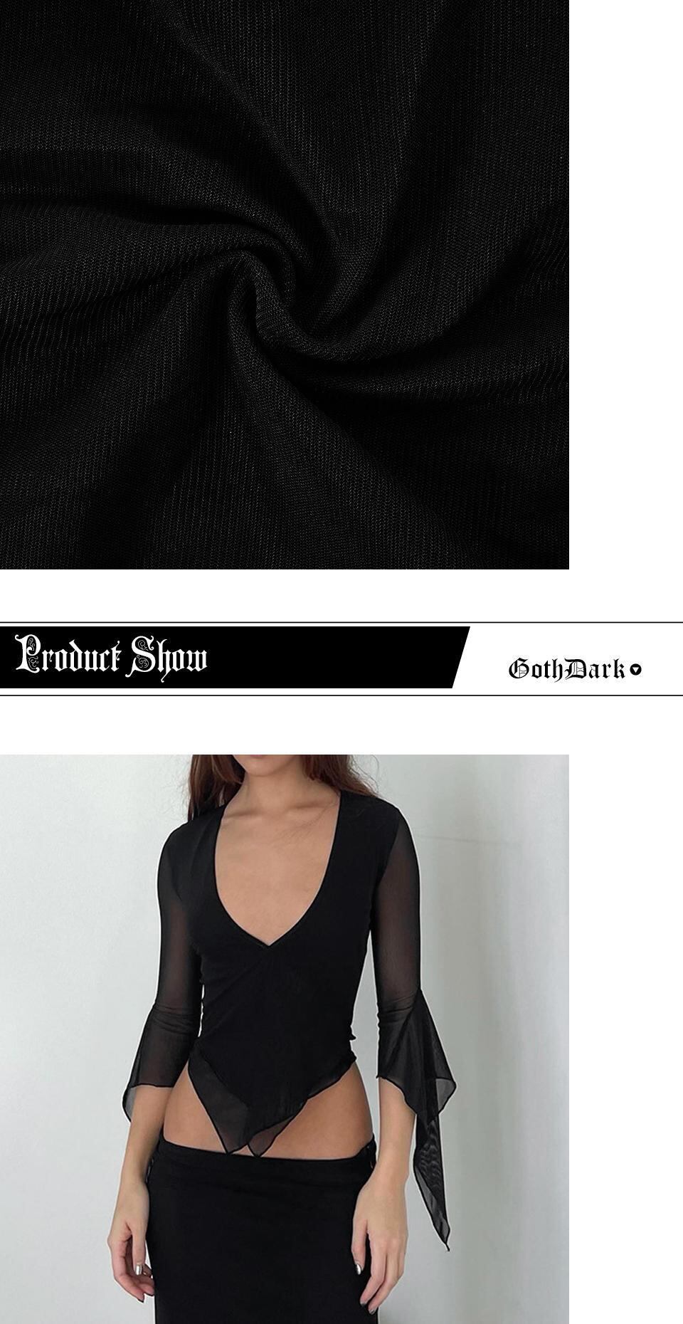 送料無料 ゴスダークサイバー Y2k メッシュ不規則な V ネックセクシーな Tシャツゴシックパンク薄手の黒人女性クロップトップスフリルスリーブストリート ブラック ラッフル Vネック AE155588793957879133