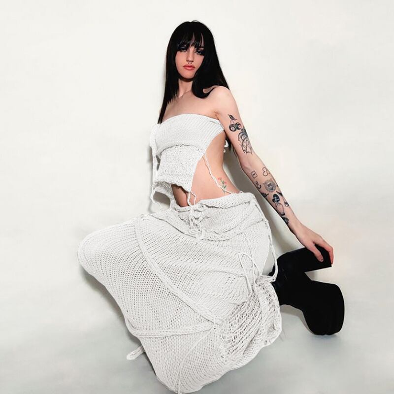 送料無料 ゴスダーク女性ゴシックセクシーなかぎ針編みロングスカートスーツ Y2k パンク背中の開いたチューブトップグランジスタイルスプリットペンシルスカート 2 点セット AE155588797114429980 | 女性の為の通販サイト-fashion navi