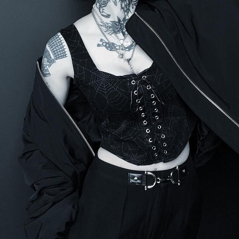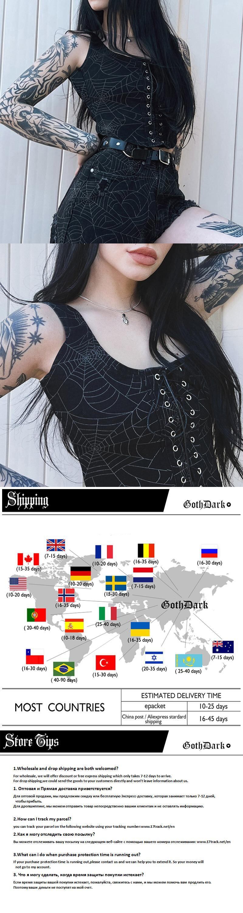 送料無料 ゴスダークスパイダーウェブモールゴシック包帯ベストグランジスタイルパンクセクシーなエモコルセットトップス黒ストリートボディコンオルタナティブクロップタンクトップ ブラック AE155588734646690318
