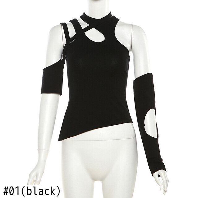送料無料 ゴスダーク不規則なカットアウト Techwear Tシャツサイバー Y2k ゴシックオープンショルダーセクシーなクロップトップスパンクボディコン女性黒 Tシャツ ブラック AE15558872957544515