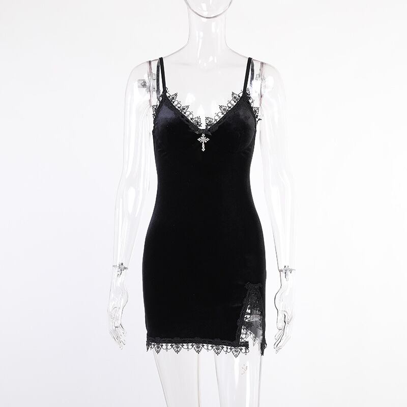 送料無料 ゴスダークヴィンテージゴシックエモ黒人女性ミニドレスグランジパンクベルベットボディコンパーティーストラップドレスレースセクシーなスリット裾クラブウェア ブラック ビンテージ AE155588775291280084