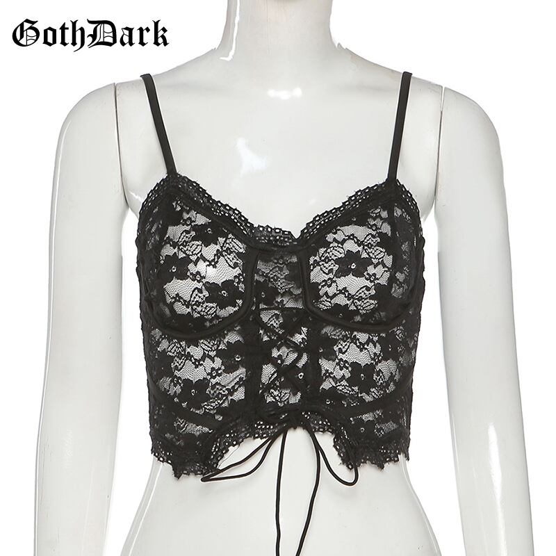 送料無料 ゴスダークレースゴシックセクシーなシースルーキャミソール黒グランジパンクモールゴス包帯クロップトップス女性ボディコン背中の開いたメッシュ服 ブラック AE155588788660056974