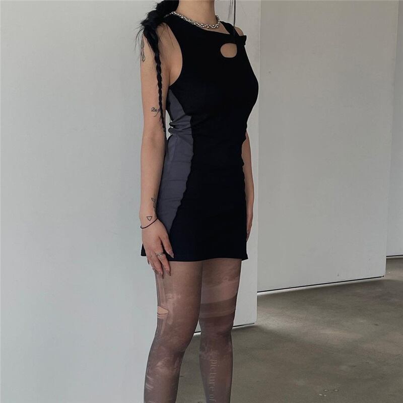 送料無料 ゴスダーク Techwear ゴシック中空アウトドレスサイバー Y2k パンクセクシーなスキニーミニドレスストリートカラーマッチ女性 AE155588717270741026