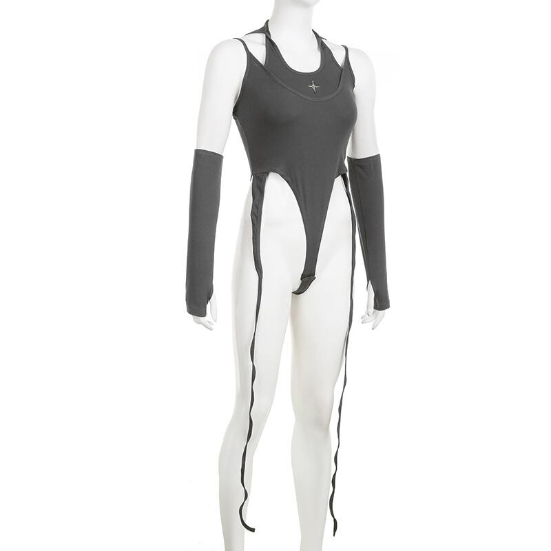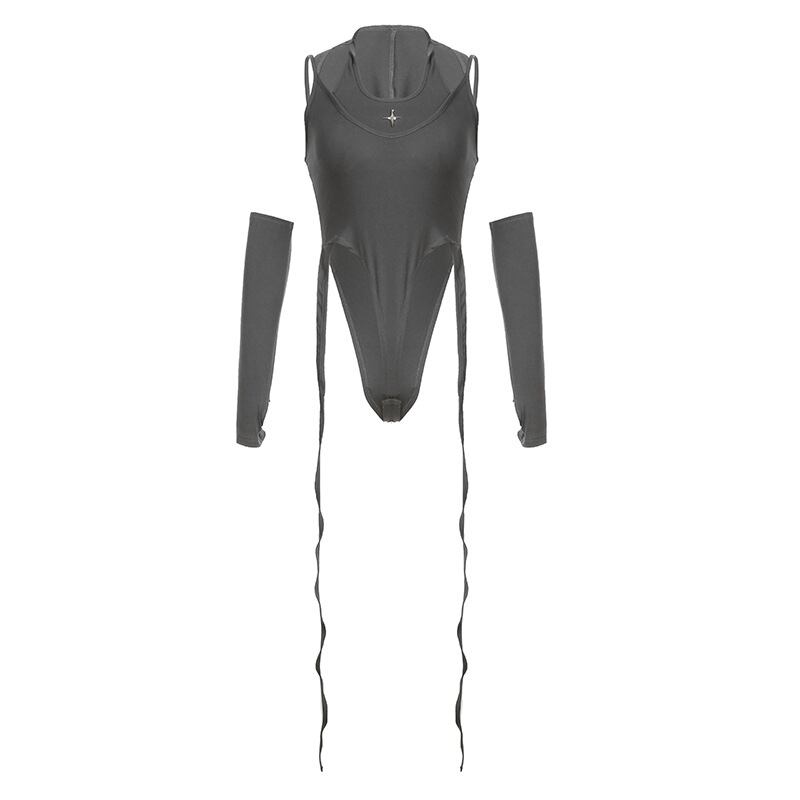 送料無料 ゴスダークサイバーゴシックウエストセクシーな女性ボディスーツ Y2k パンクフード付き背中の開いた 2 個セットトップスボディコングローブスリーブボディスーツ AE155588795480762071