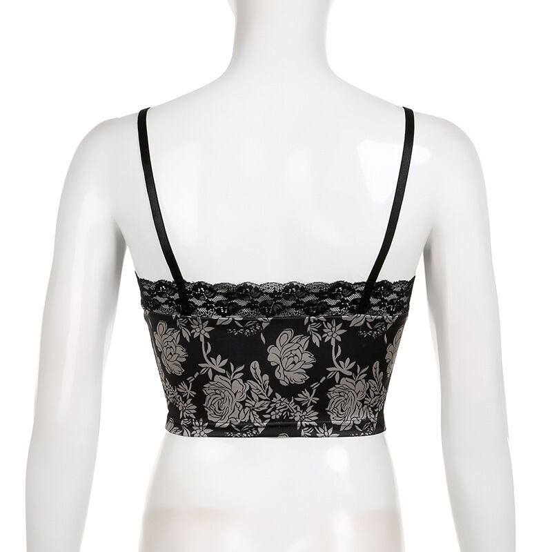 送料無料 ゴスダークフローラルプリントモールゴシックキャミソールレーストリムグランジスタイルセクシーな女性クロップトップス Y2k e ボディコン背中の開いた衣装 花柄 AE15558872849598954