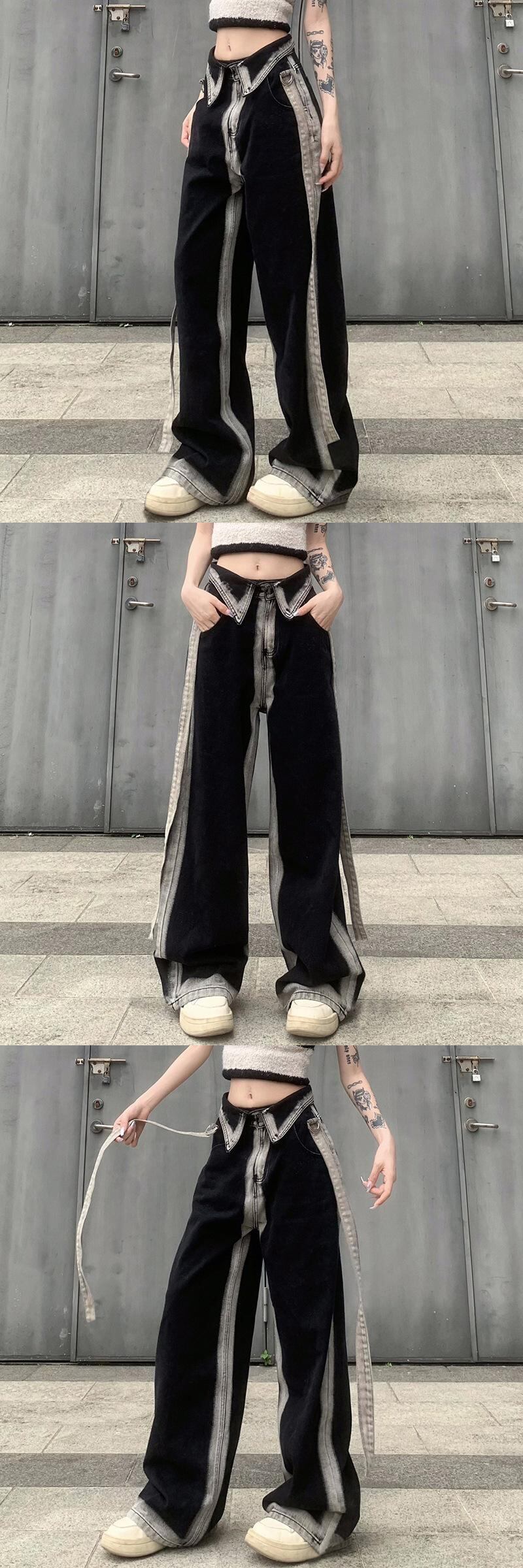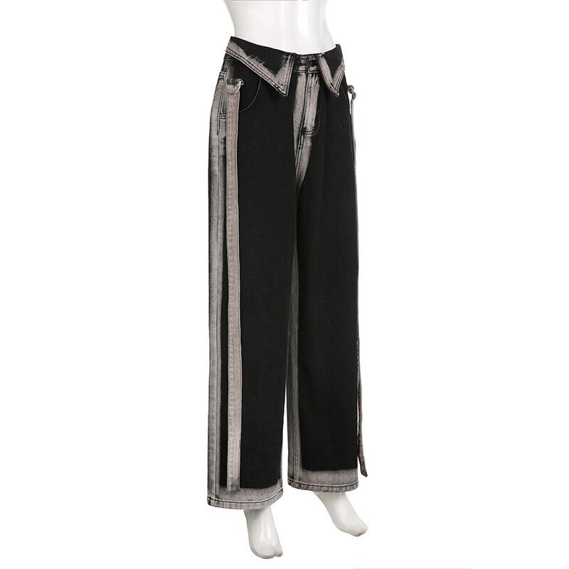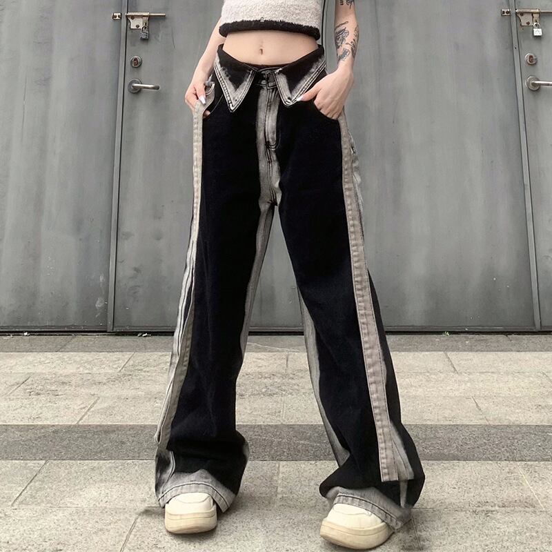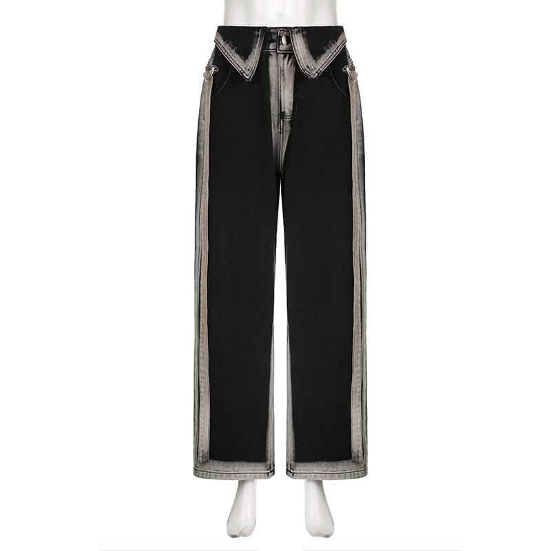 送料無料 ゴス ダーク グランジ フォールド ウエストバンド ジーンズ ゴシック ローライズ ワイドレッグ バギー パンツ Y2k パンク タイダイ ブロック カラー ストリートウェア ワイドパンツ AE155588774643296871