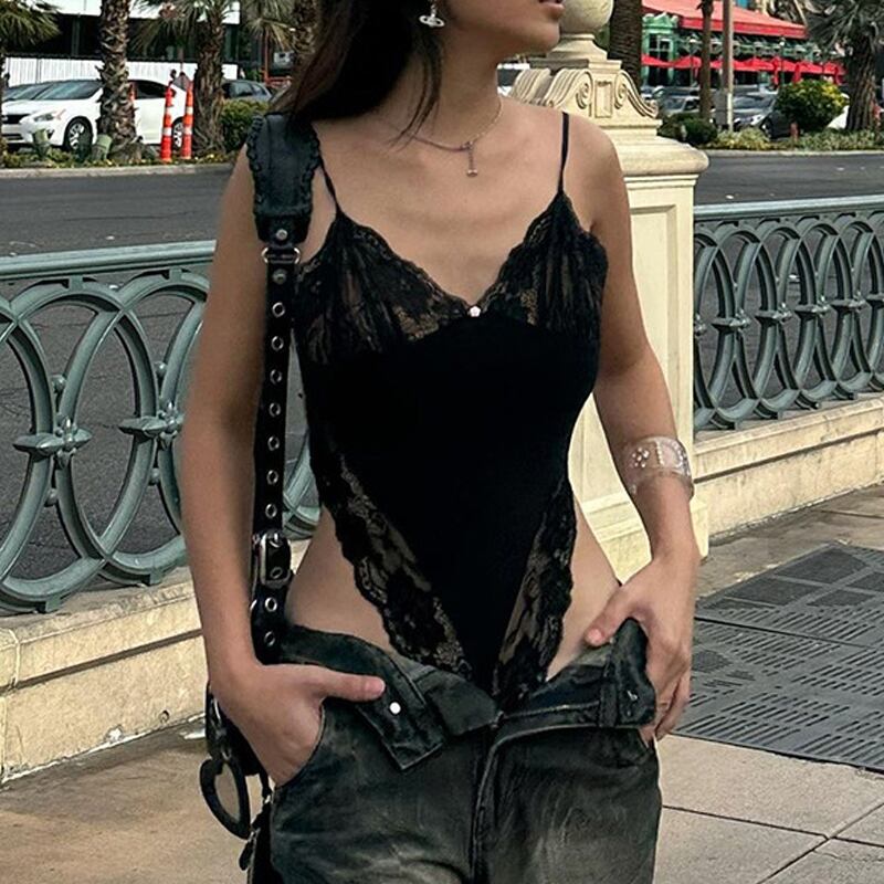 送料無料 ゴスダークパッチワークセクシーなレースゴシックボディスーツ Y2k 背中の開いた V ネックキャミソール女性カットボディコン夏スリングボディスーツ サマー 夏物 Vネック AE155588728251384635
