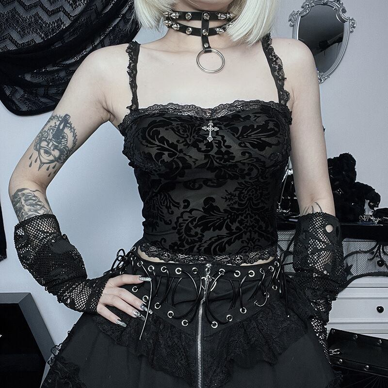 送料無料 ゴスダークロマンチックモールゴシックヴィンテージセクシーなキャミソールグランジ美的薄手の傷クロップトップスレーストリムベルベット女性 Alt 服 ビンテージ AE155588782641401405 | 女性の為の通販サイト-fashion navi