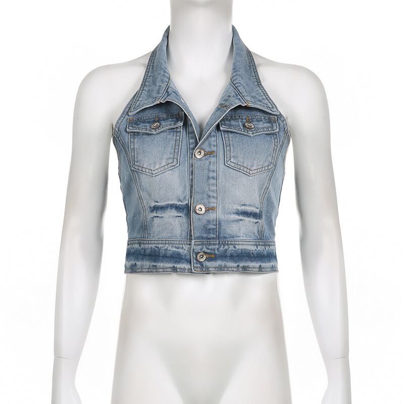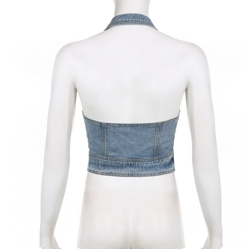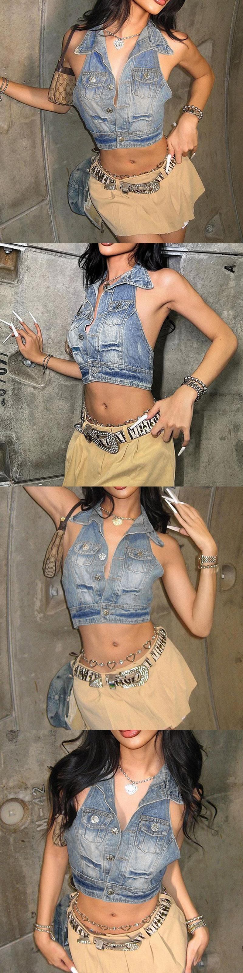 送料無料 ゴスダーク Y2k ストリートセクシーなホルターデニムトップスサイバーゴシックターンダウン襟クロップトップ女性グランジ洗浄ボタンアップパーティーベスト AE155588712504871179
