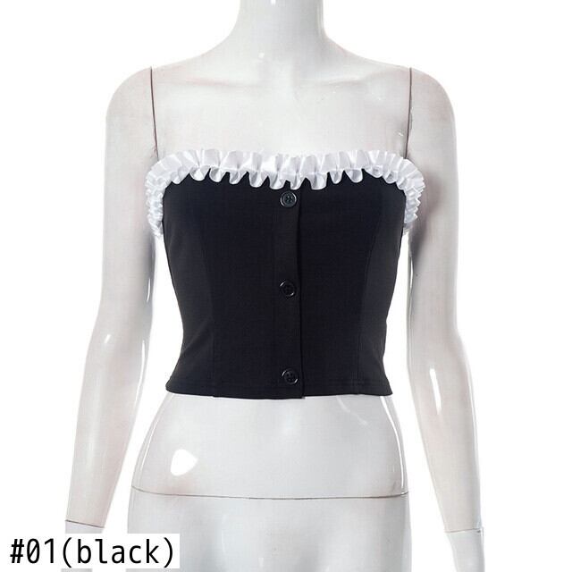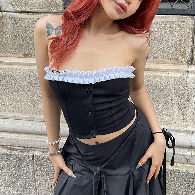 送料無料 ゴスダークフリルトリムゴシックボタンアップチューブトップス Y2k パンクセクシーな背中の開いた女性作物ストラップレスボディコンストリート黒ラップ胸 ブラック AE155588732131678743