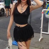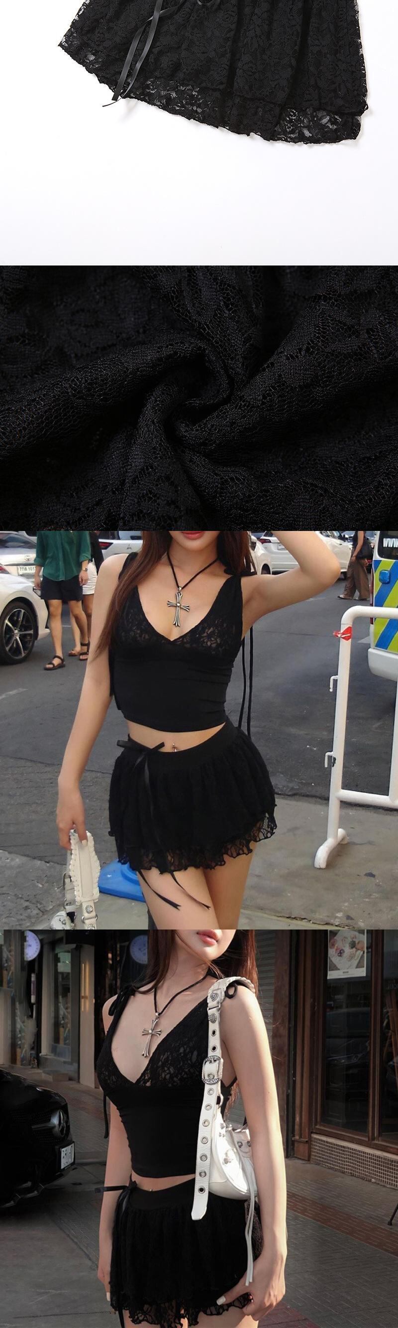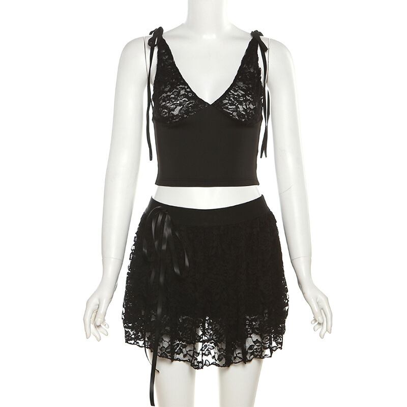 送料無料 ゴスダークセクシーなレースゴシックスカートスーツ女性 V ネックキャミソールタイアップボディコンクロップトップスウエストリボンミニスカート 2 点セット夏 サマー 夏物 Vネック AE155588780617609486