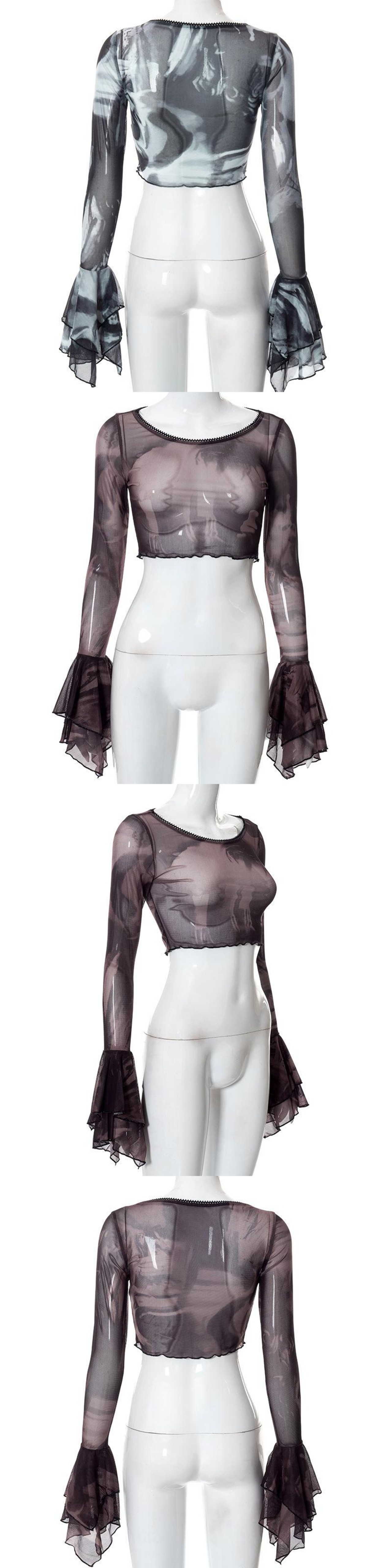 送料無料 ゴスダークパンク美的プリント Y2k メッシュ女性クロップトップスゴシックフレアスリーブシースルー Tシャツエモレタス裾セクシーなストリート AE155588758430213146 | 女性の為の通販サイト-fashion navi
