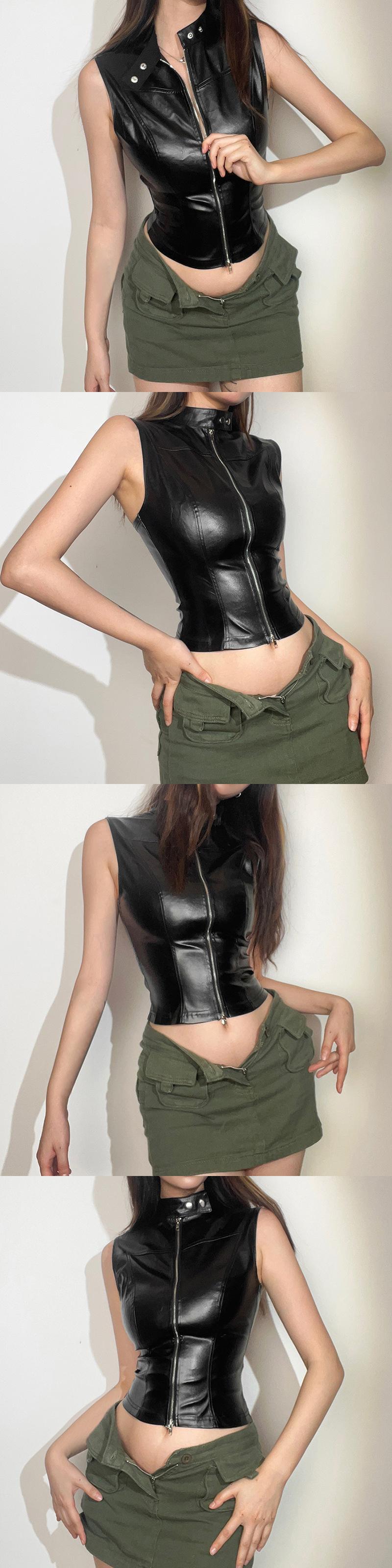 送料無料 ゴスダークグランジスタイルパンクフェイク Pu ジップアップタンクトップサイバー Y2k モールゴシック背中の開いたセクシーなクロップトップ女性モックネックボディコンベスト ファー AE155588750993557143