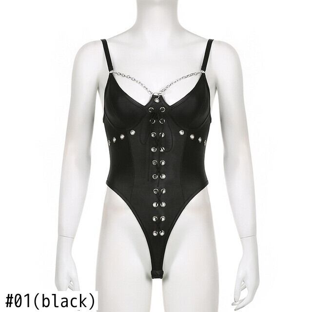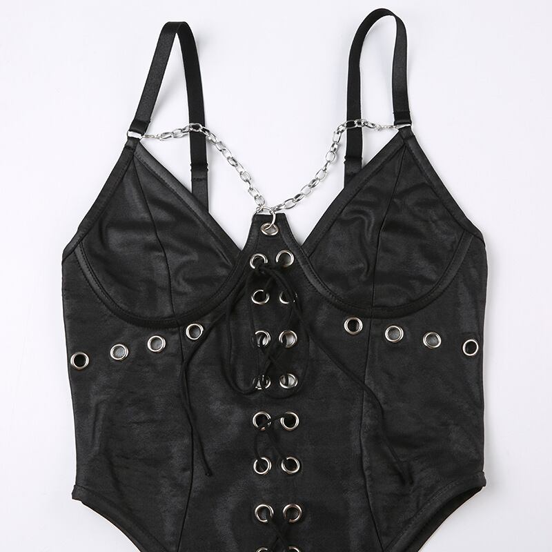 送料無料 ゴスダークサイバー Y2k パンクチェーンタイアップボディスーツゴシックグランジ薄手の背中の開いたセクシーなトップス女性カットアイレットレイブパーティーボディスーツ AE155588793681661917